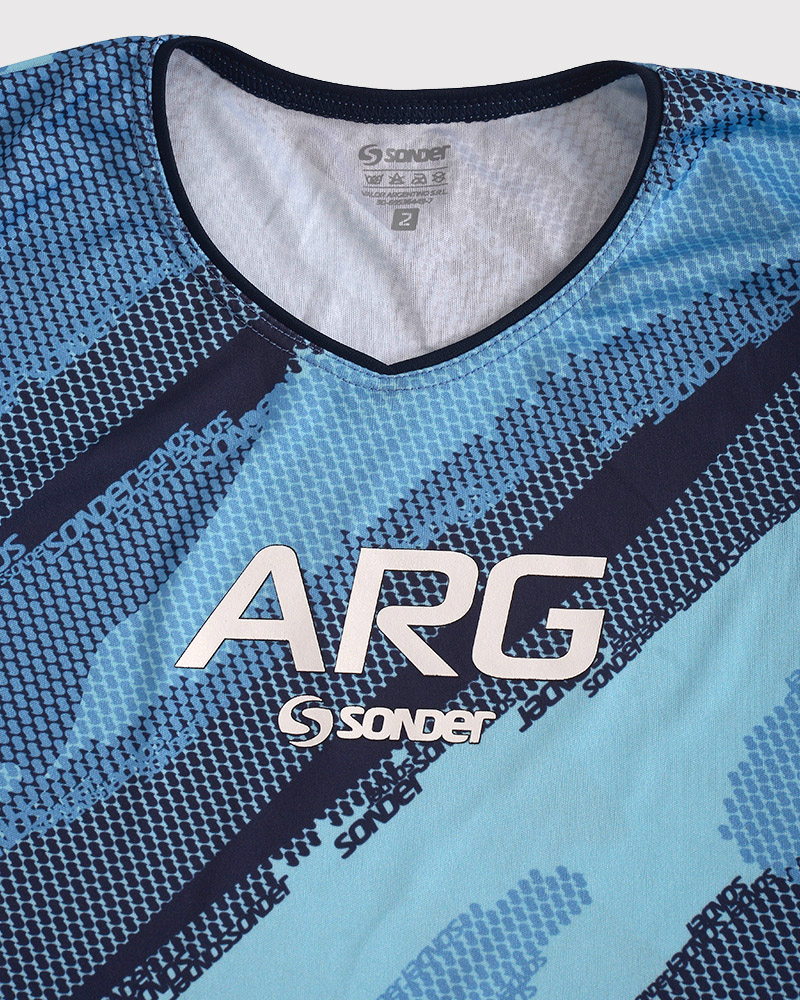 LÍNEA ARGENTINA. Remera clásica unisex de niños. De poliéster NEODRY estampado Tramo Celeste. La tecnología del poliéster Neodry permite mayor respirabilidad, rápido secado, confort térmico, color y textura resistentes.