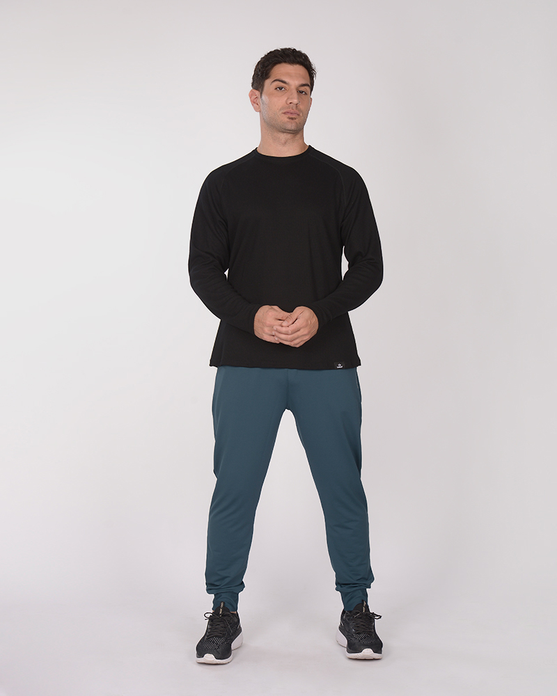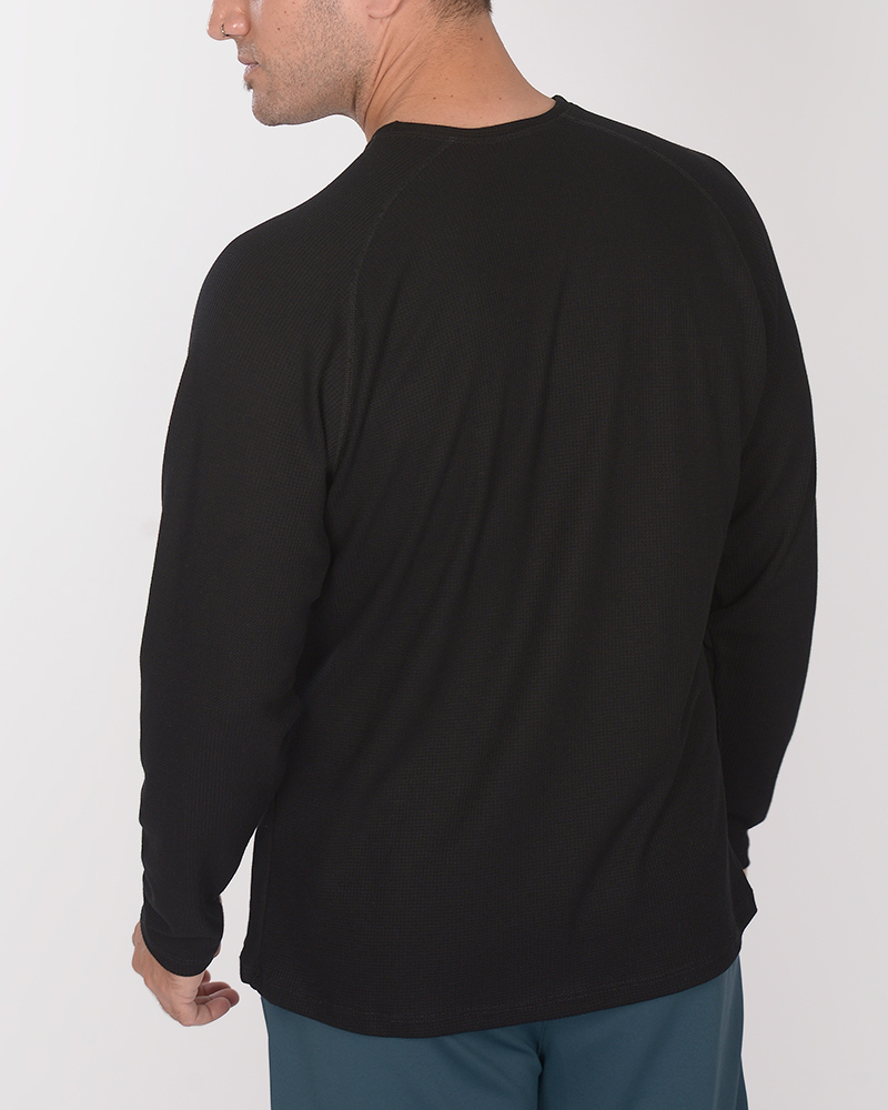 Buzo cuello redondo de waffle elastizado negro, con costura bordada en mangas.