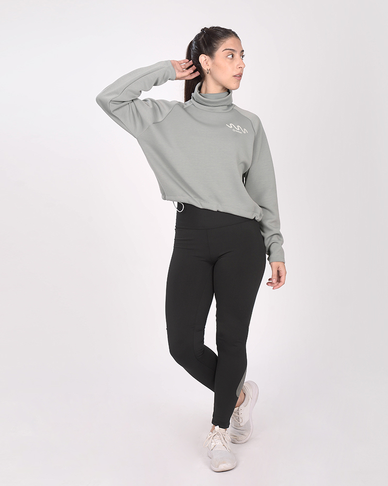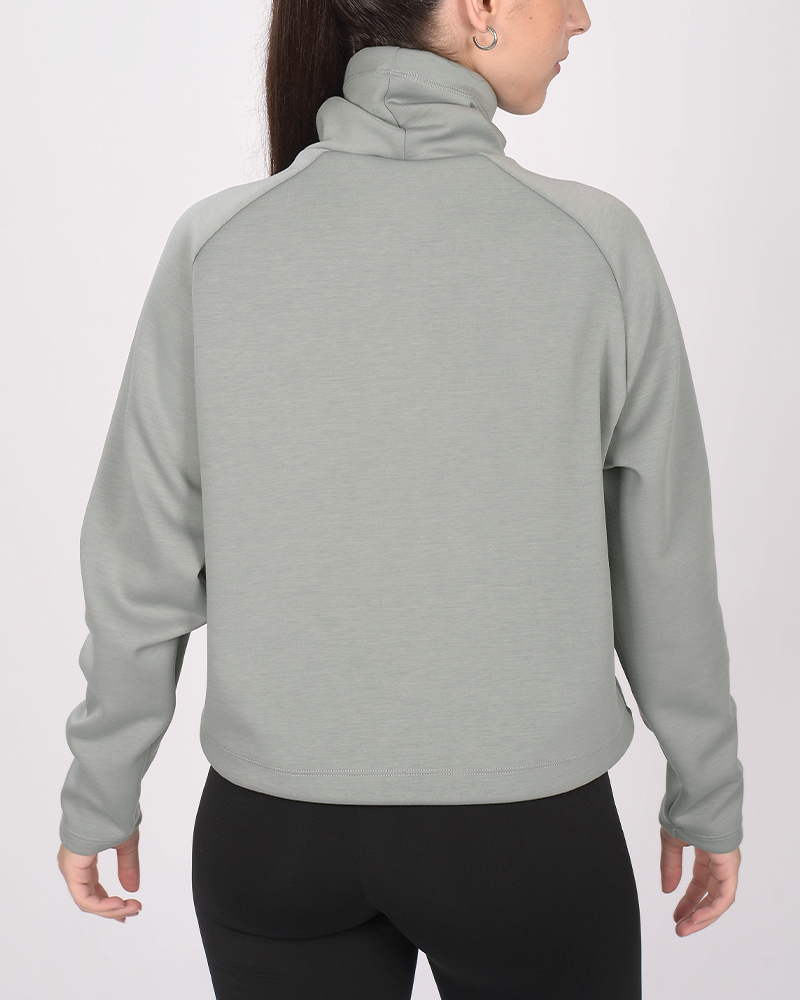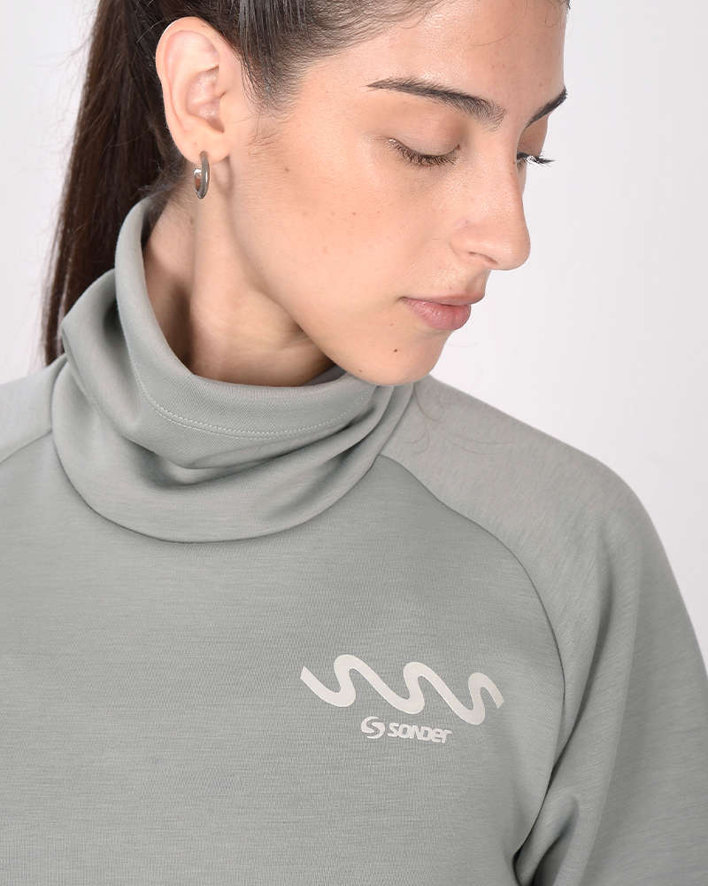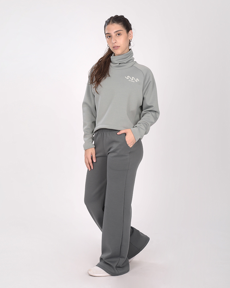 Buzo holgado con cuello alto de scuba elastizado gris acero. La scuba es un tejido elastizado y de tacto suave.