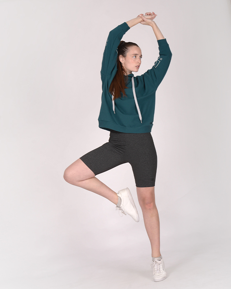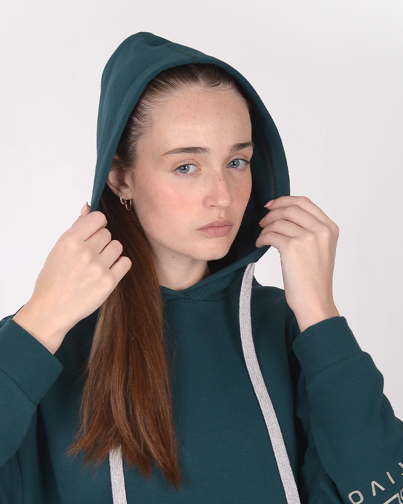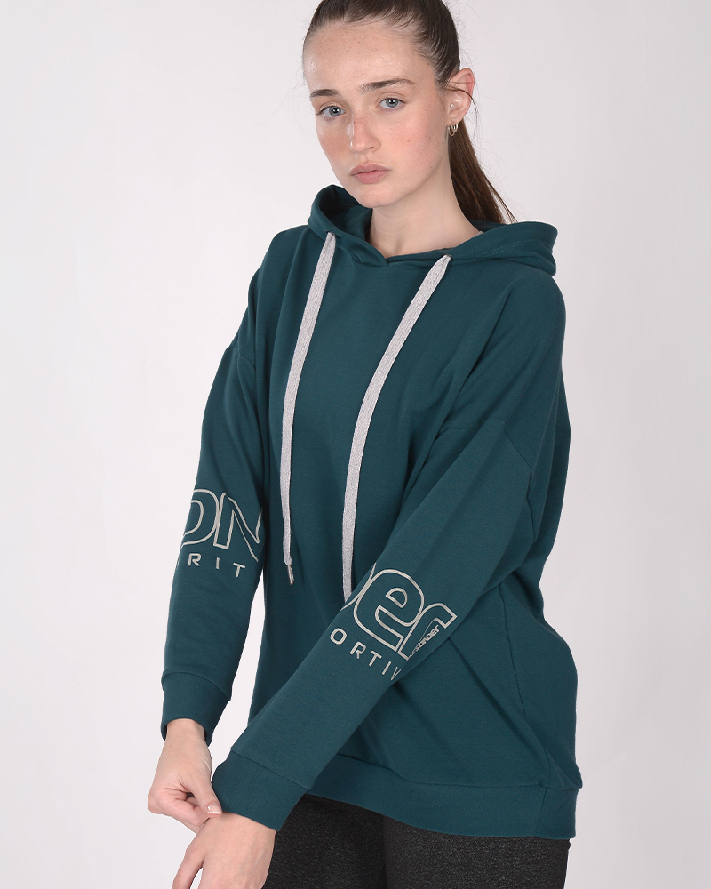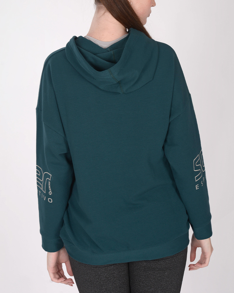 Buzo holgado de rústico liviano elastizado lyon, con bolsillos, capucha y estampa.