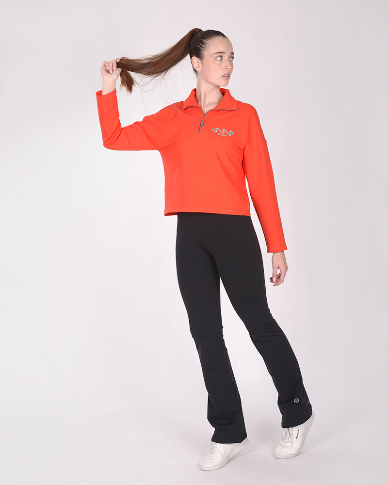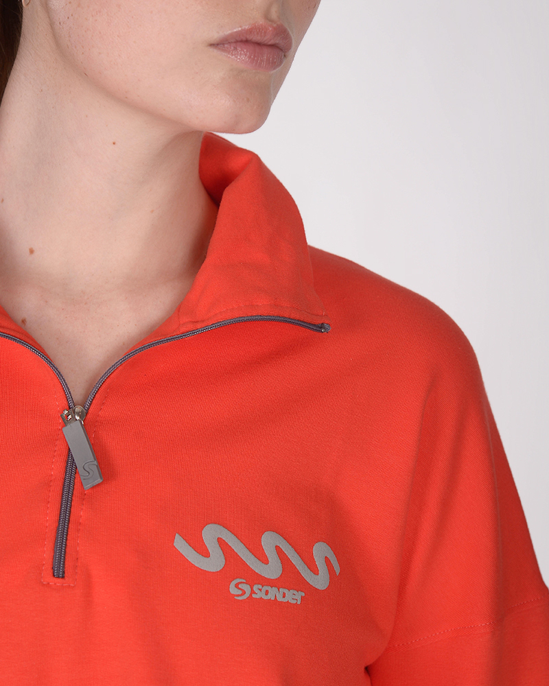 Buzo corto con medio polera con cierre de rústico liviano elastizado rojo coral, con estampa.