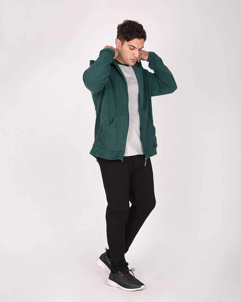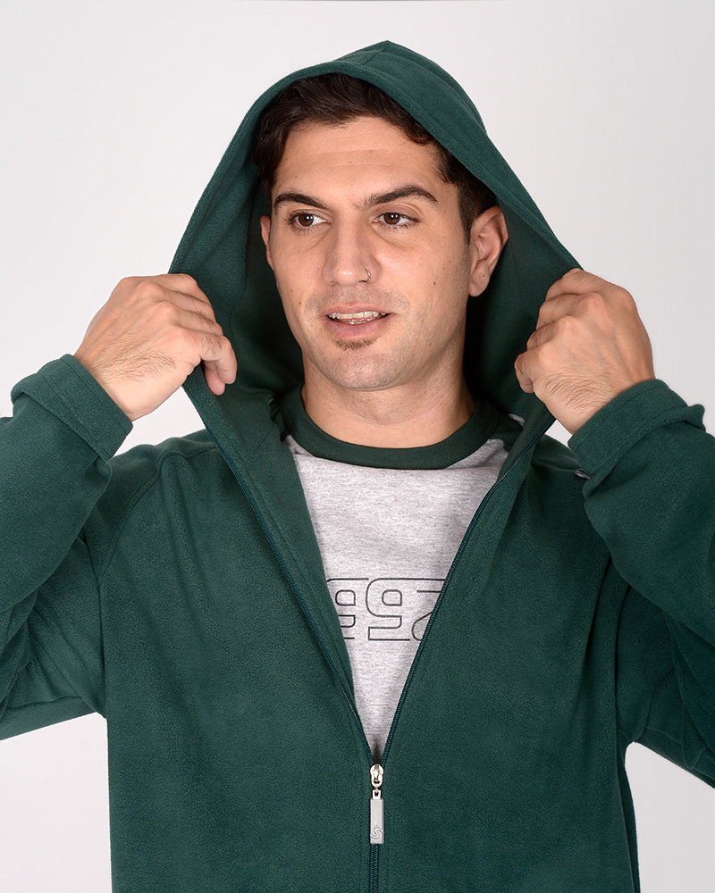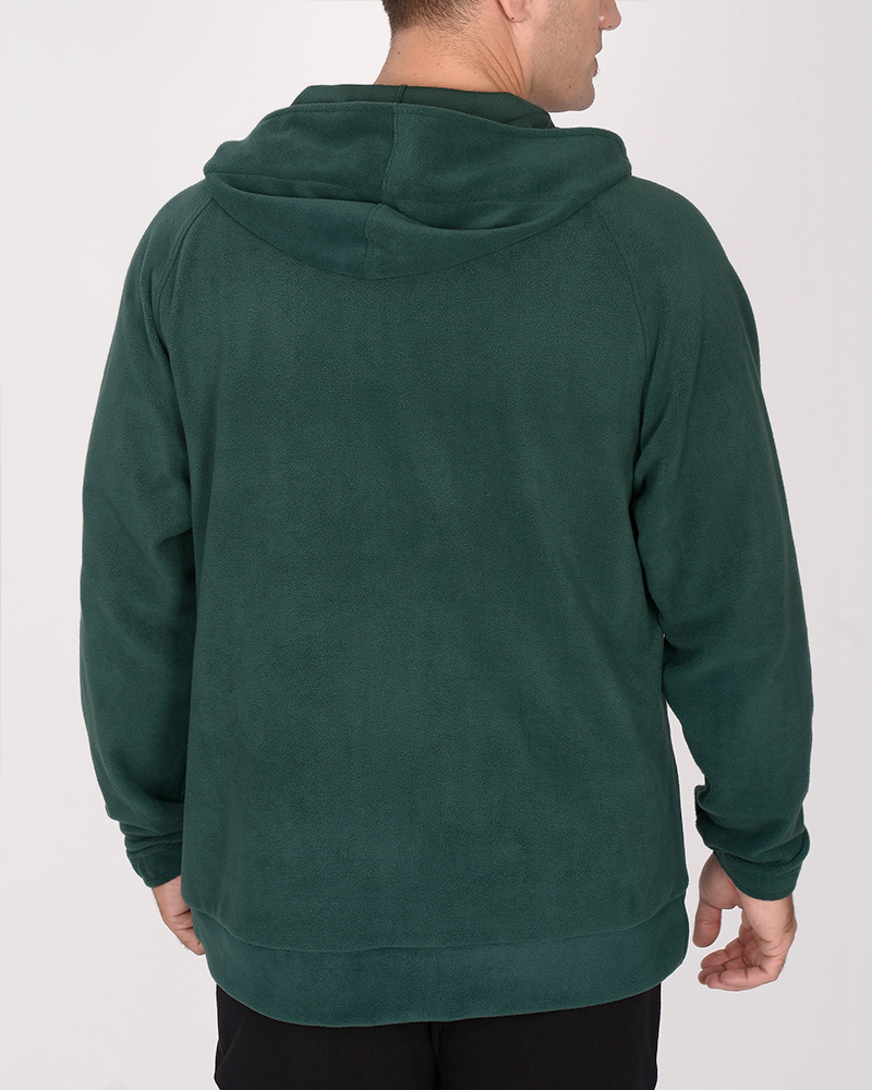 Campera de micropolar verde noche, con capucha y bolsillos.
