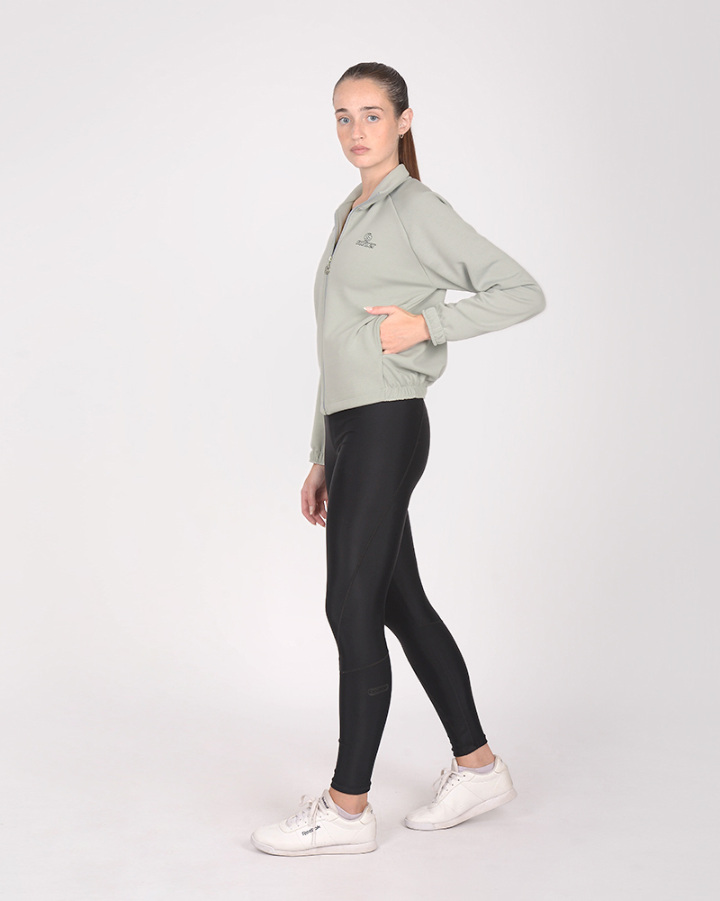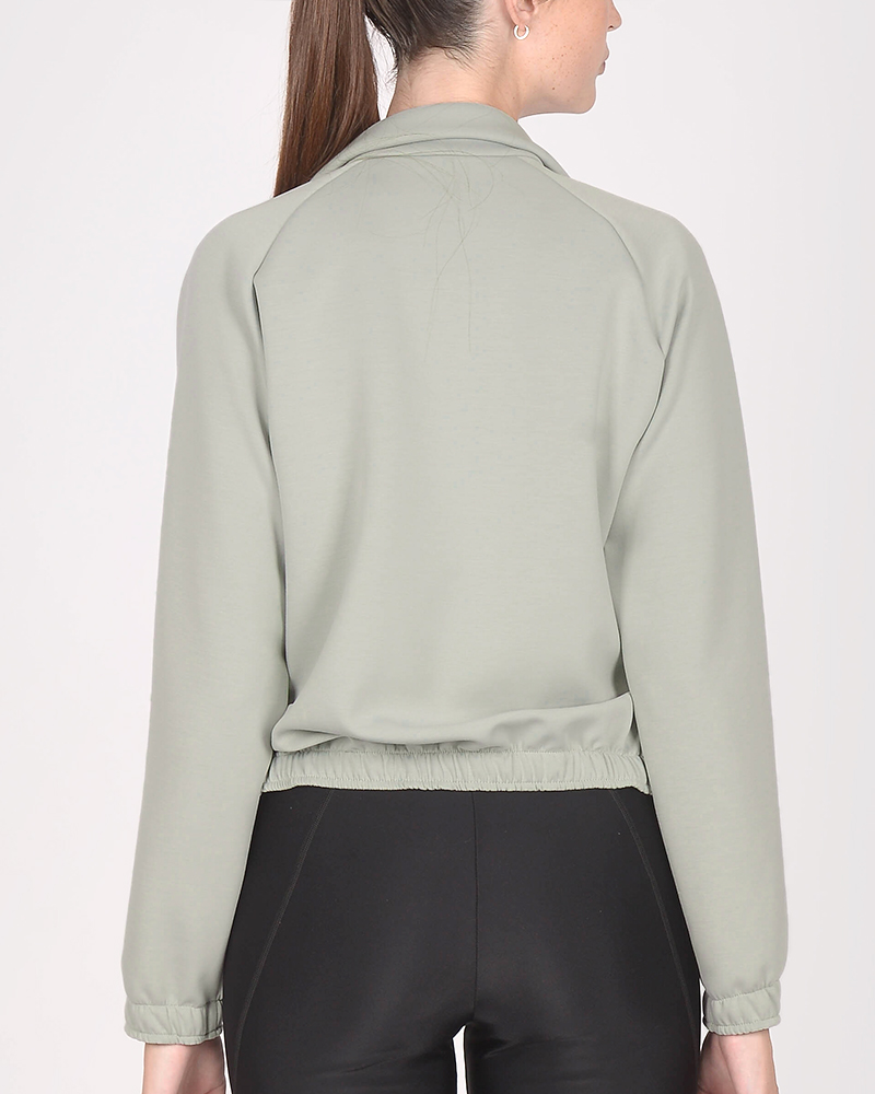 Campera holgada de scuba elastizada gris claro. El tacto es suave, con frisa liviana.