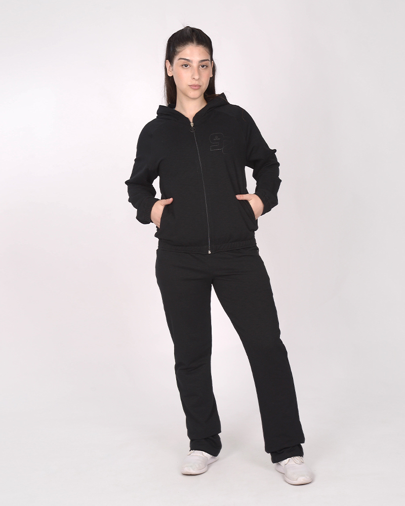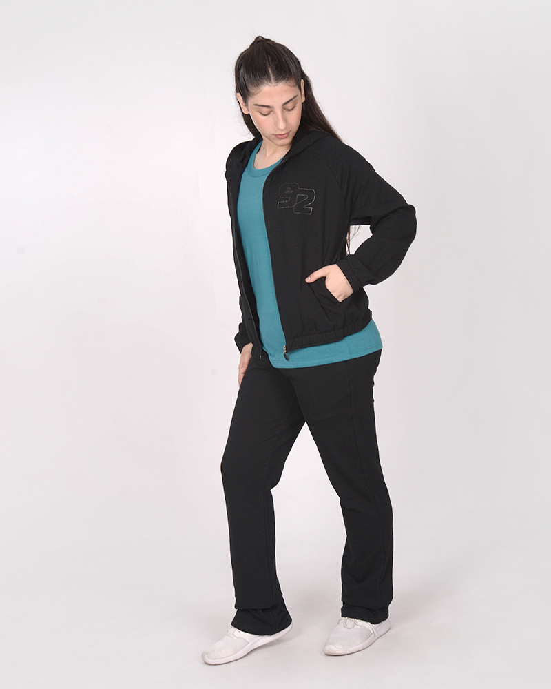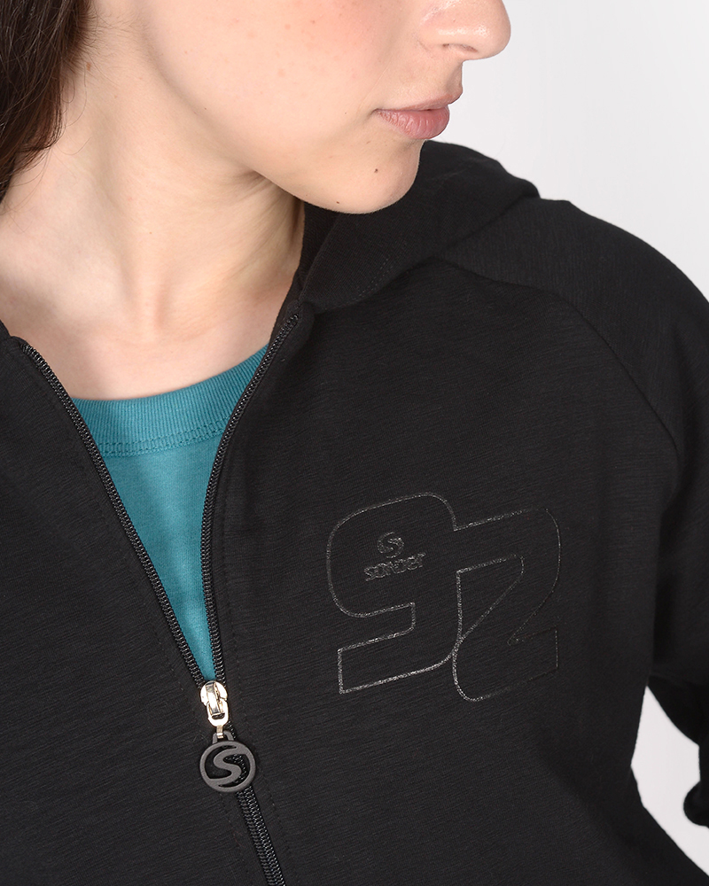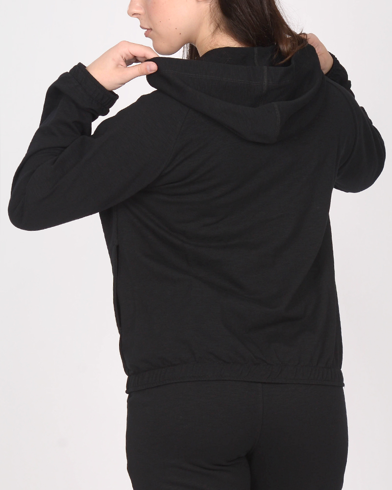 Campera holgada de rústico flamé elastizado negro, con capucha, bolsillos y estampa.