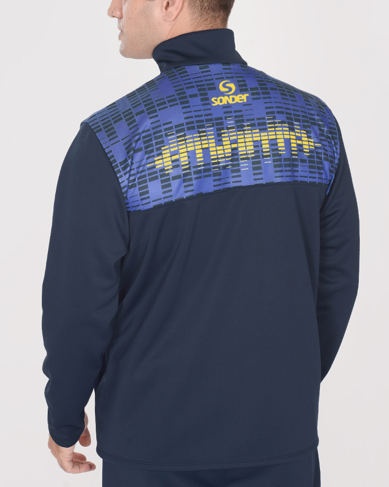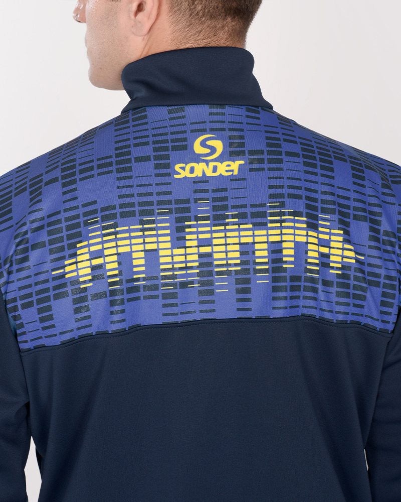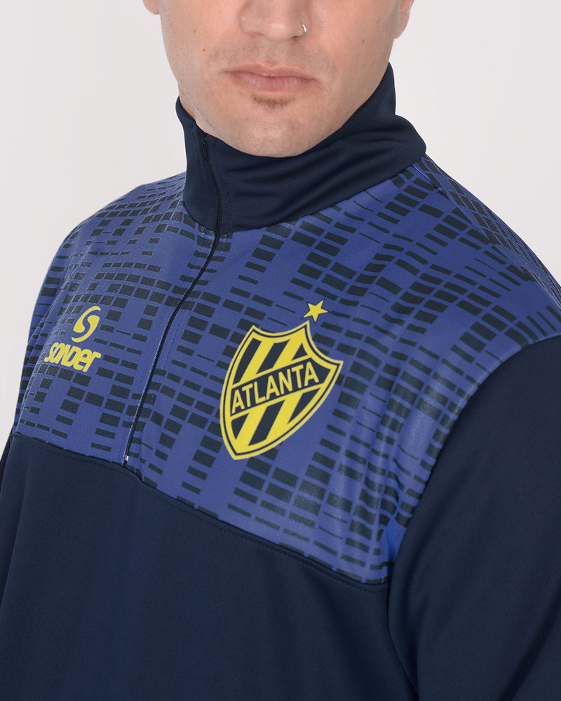INDUMENTARIA OFICIAL DE PASEO ATLANTA 2026. Buzo medio cierre de deportivo azul, combinado, con escudo.