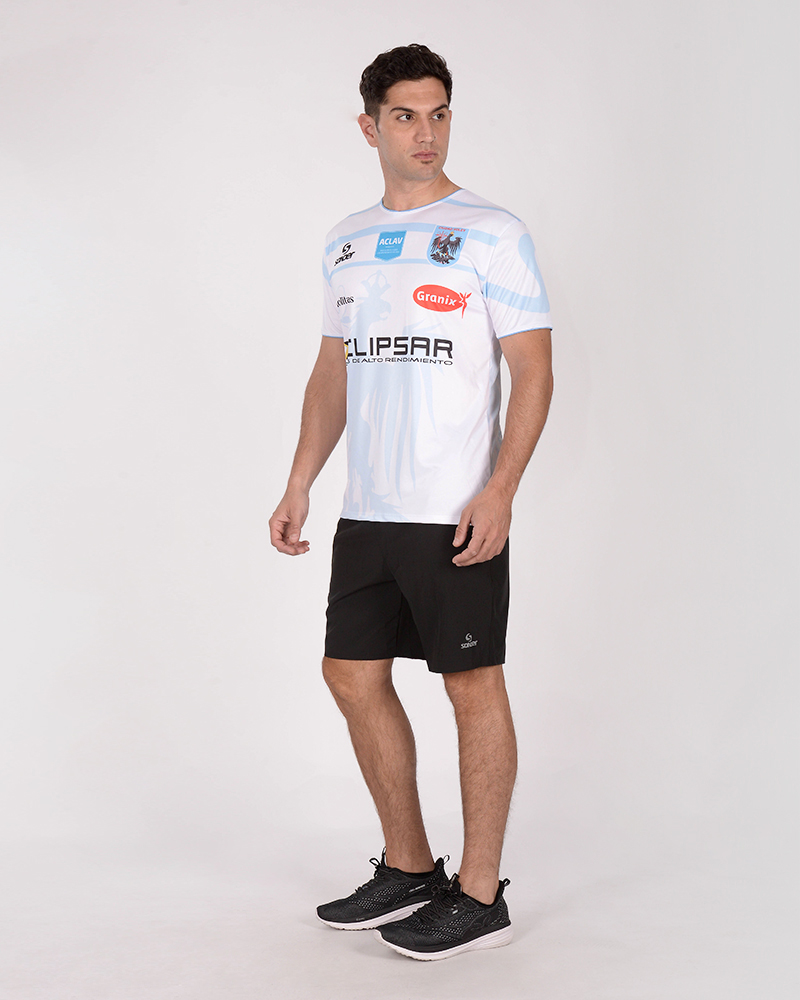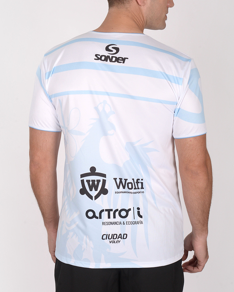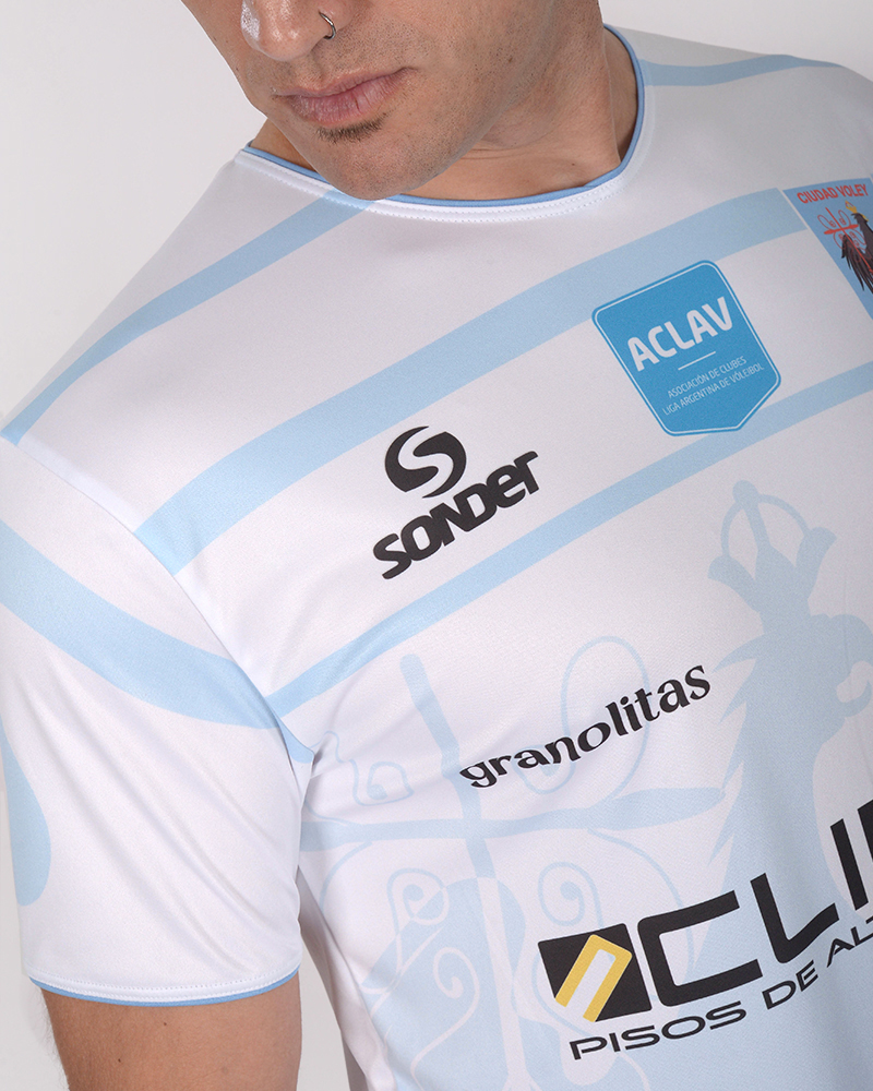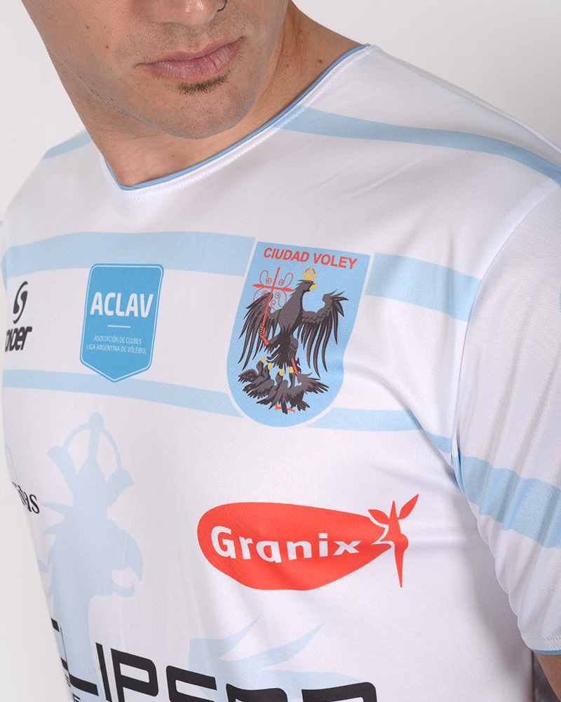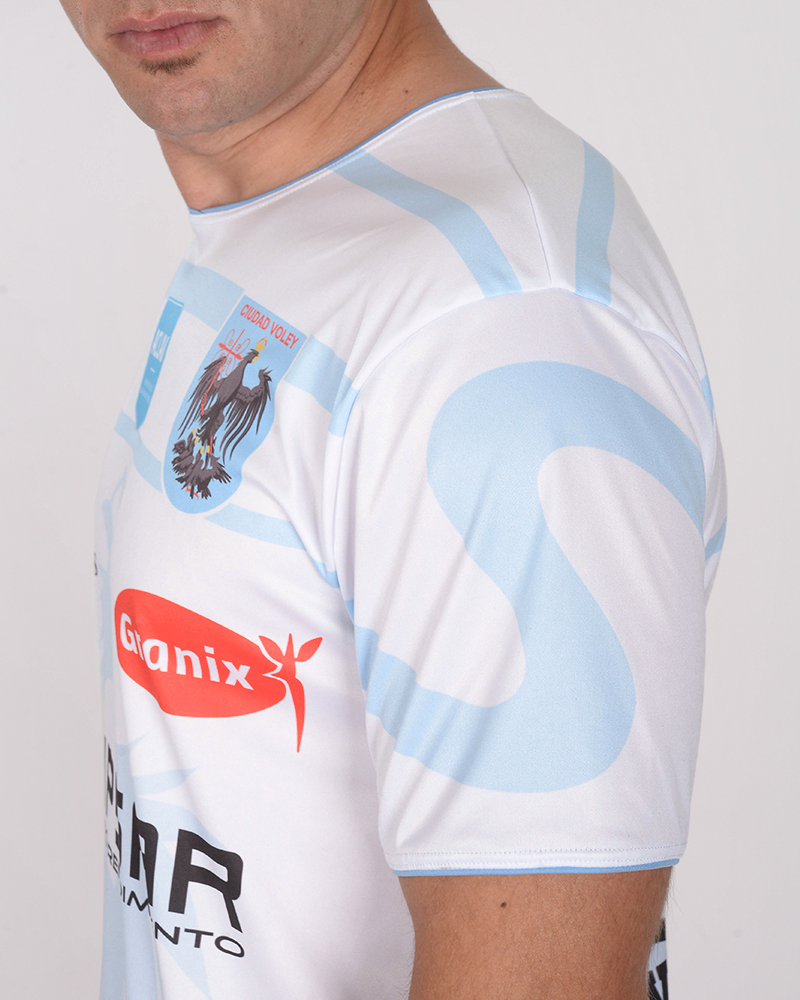 INDUMENTARIA OFICIAL DE JUEGO 2025 CIUDAD VOLEY. Camiseta entallada de poliéster sublimado blanca. Con sponsors. Sin nombre jugador o número.