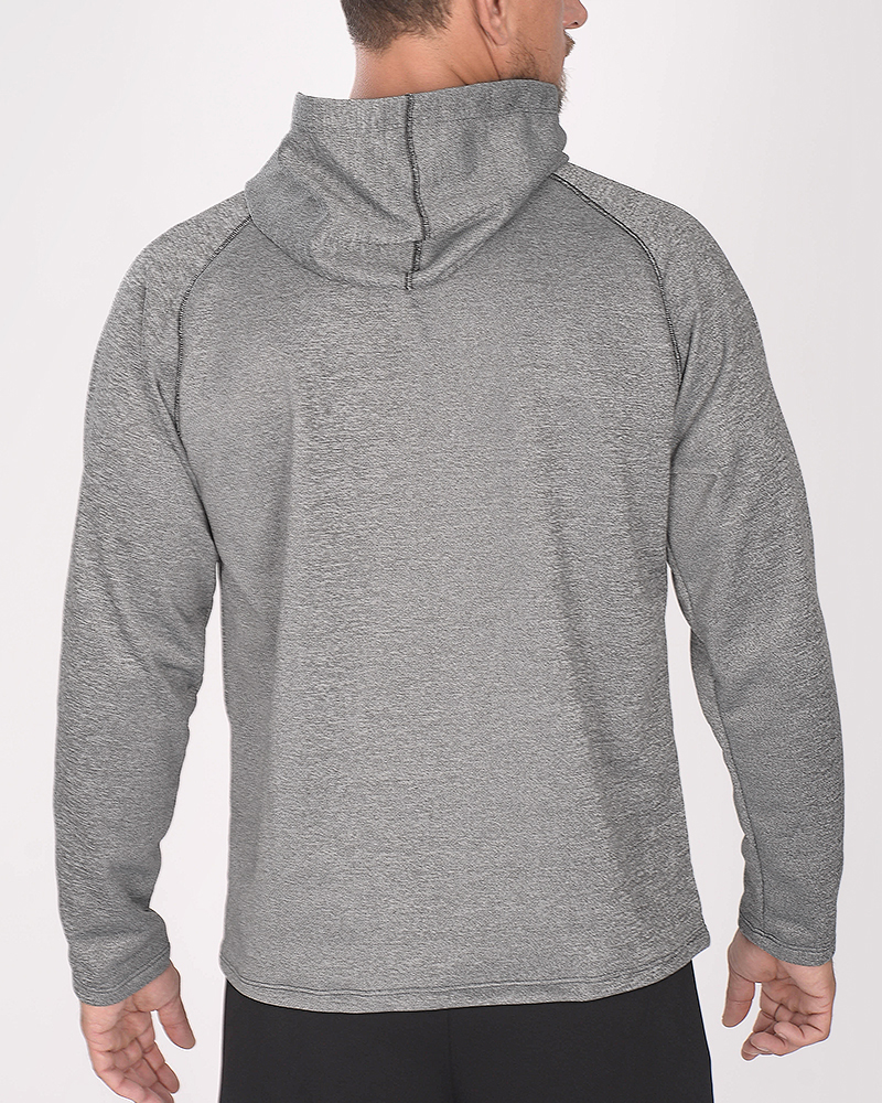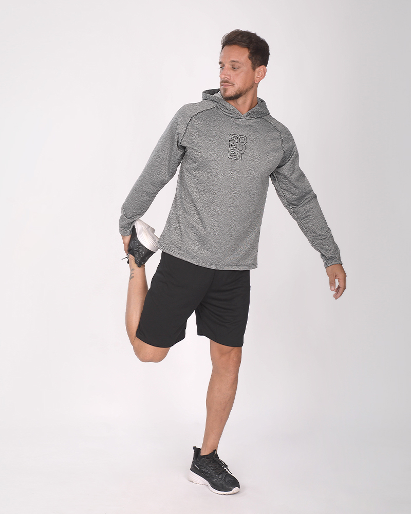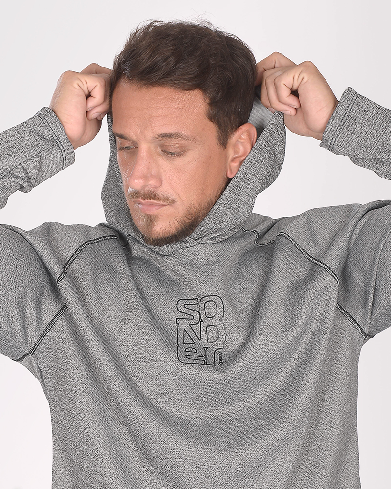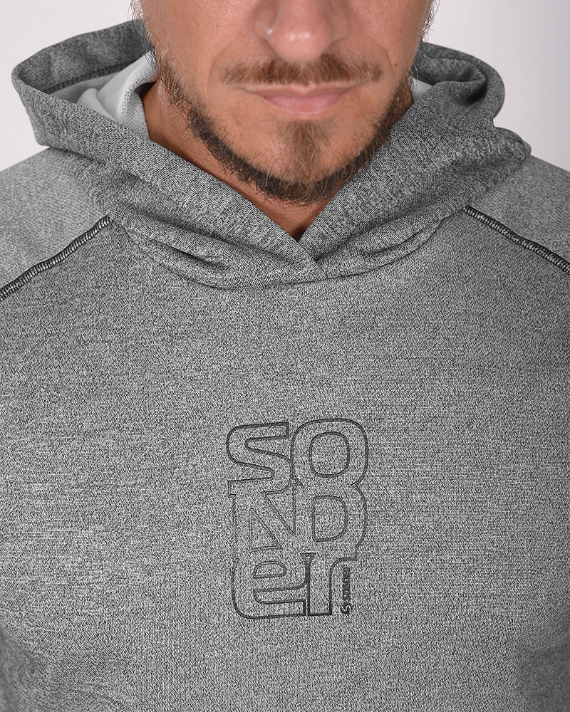 Buzo de rústico fantasía gris oscuro melange con capucha, costura bordada y estampa.