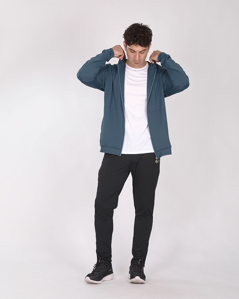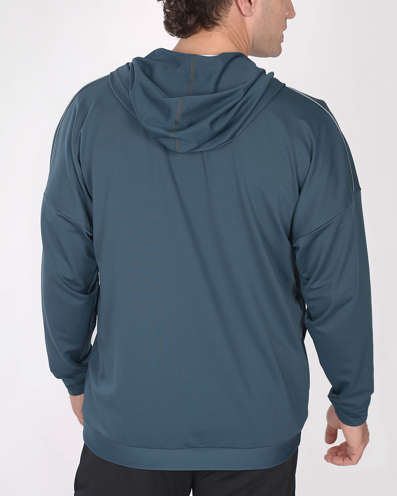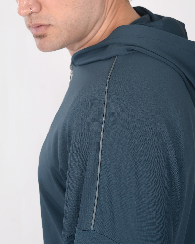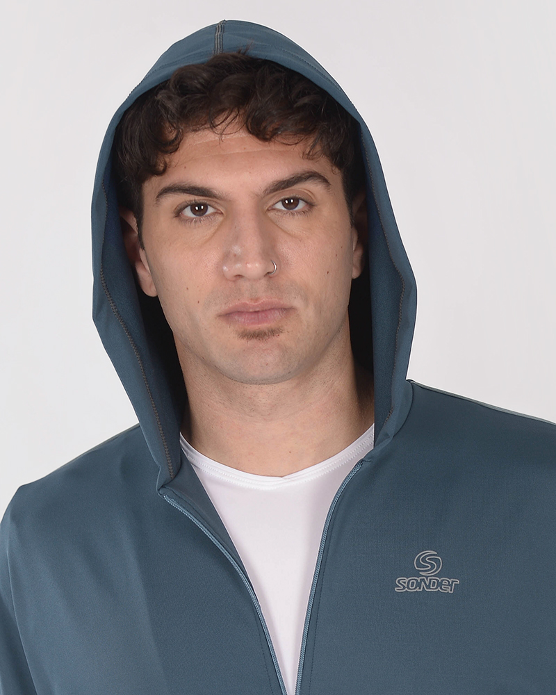 Campera de rústico de polièster elastizado azul marino claro, con capucha, bolsillos, vivos y estampa.