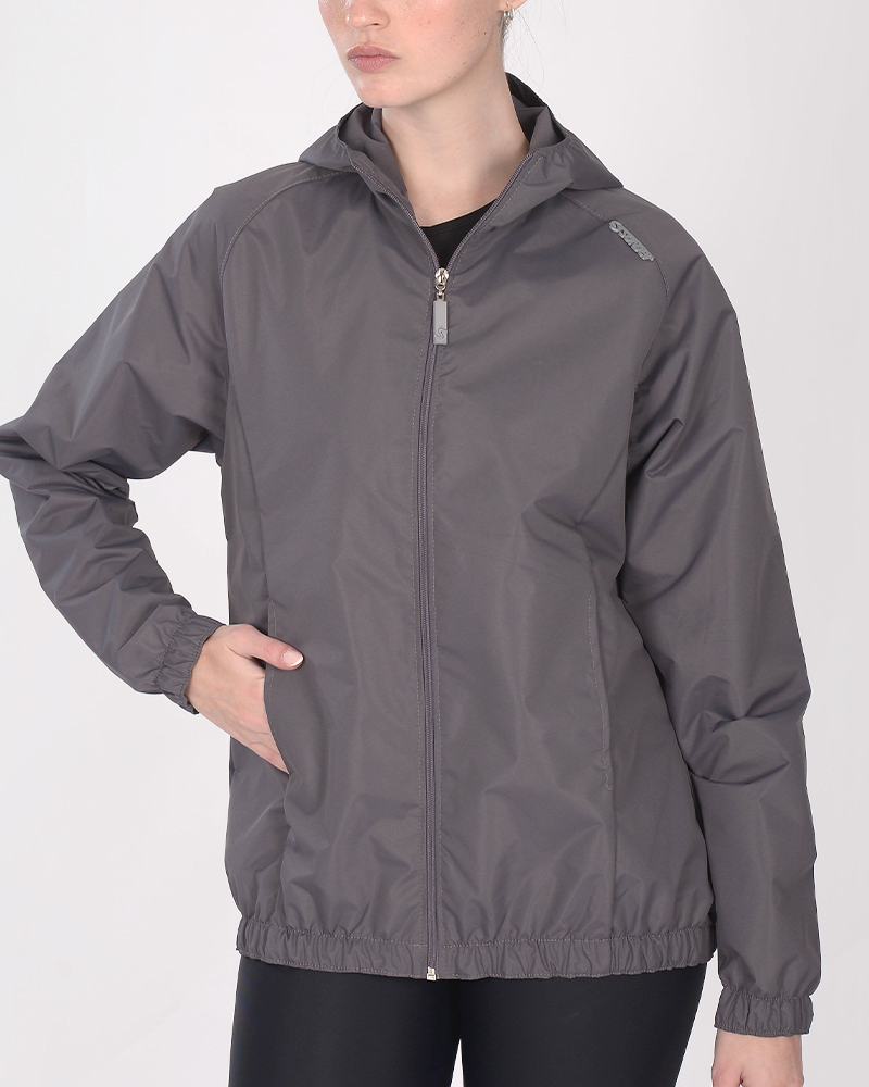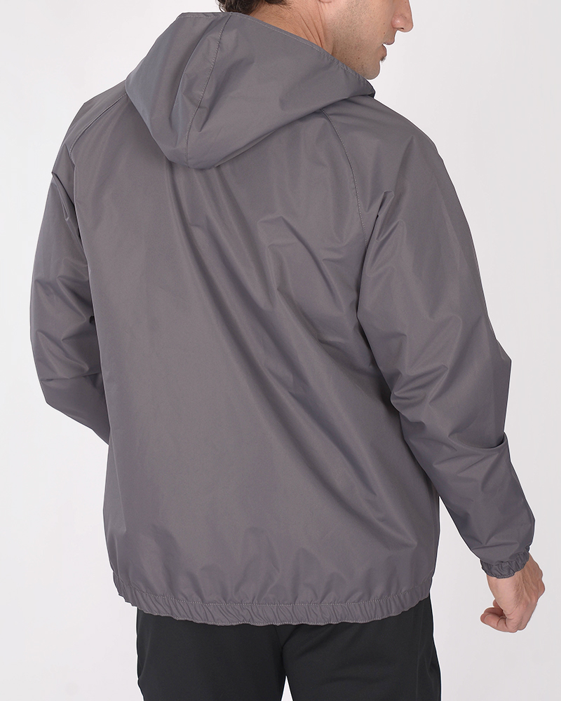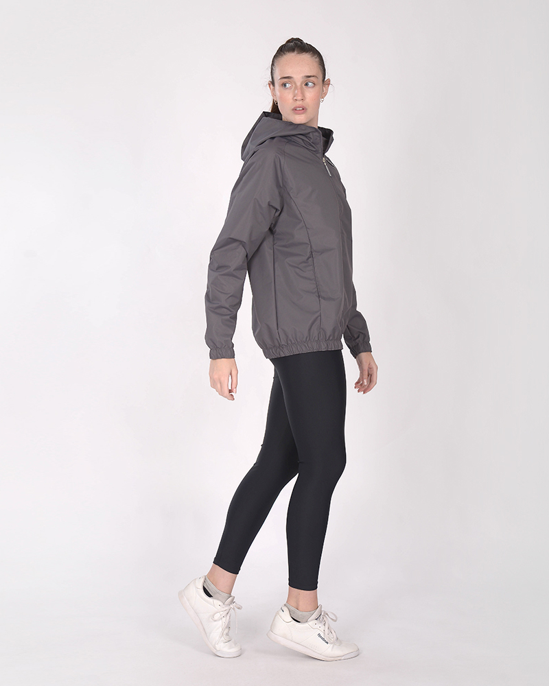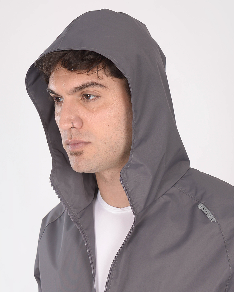 Campera unisex impermeable gris plomo. Con capucha y bolsillos.