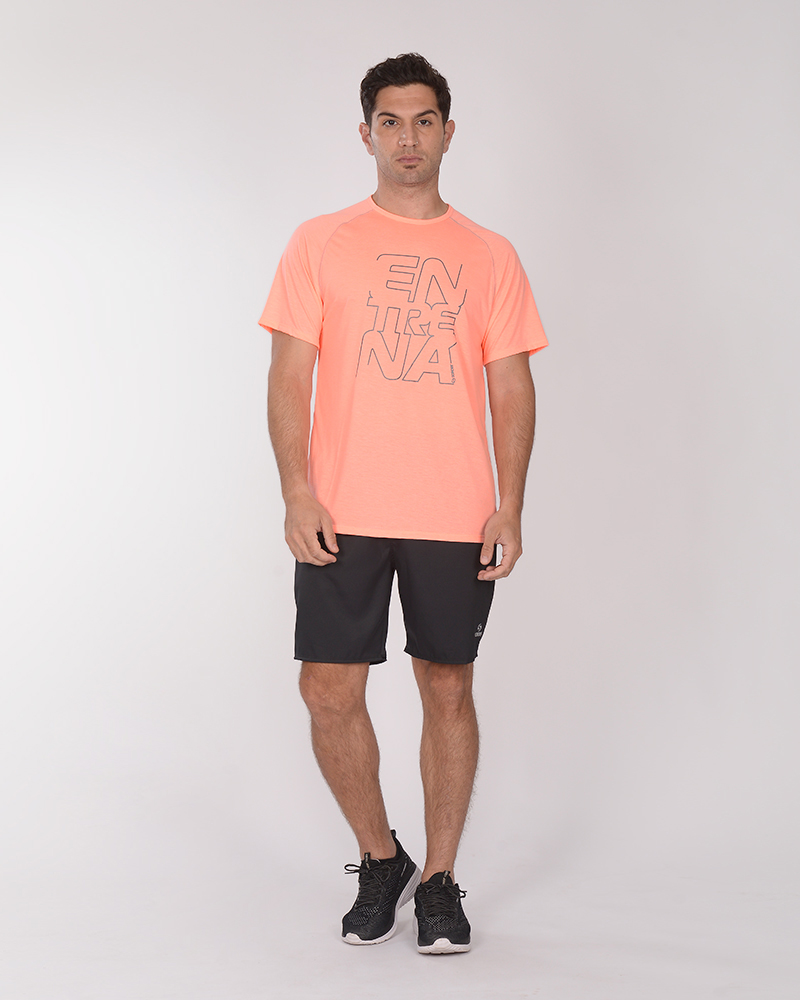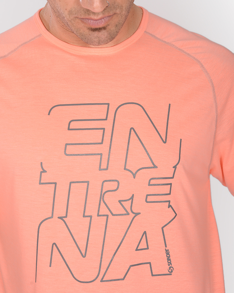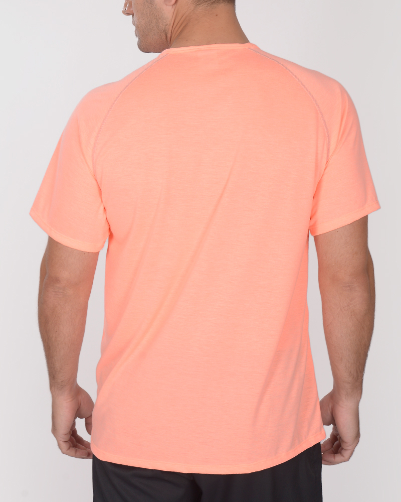 Remera clásica de jersey liviano coral flúo con costura bordada y estampa.