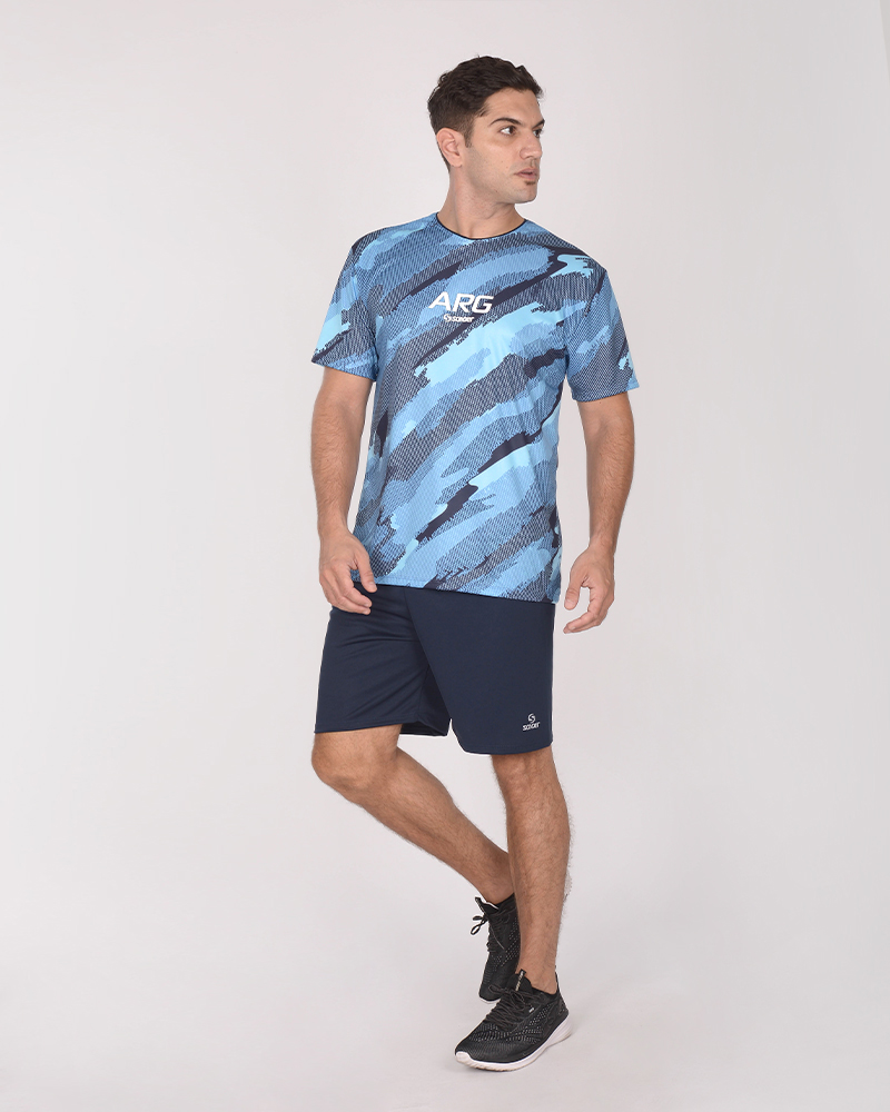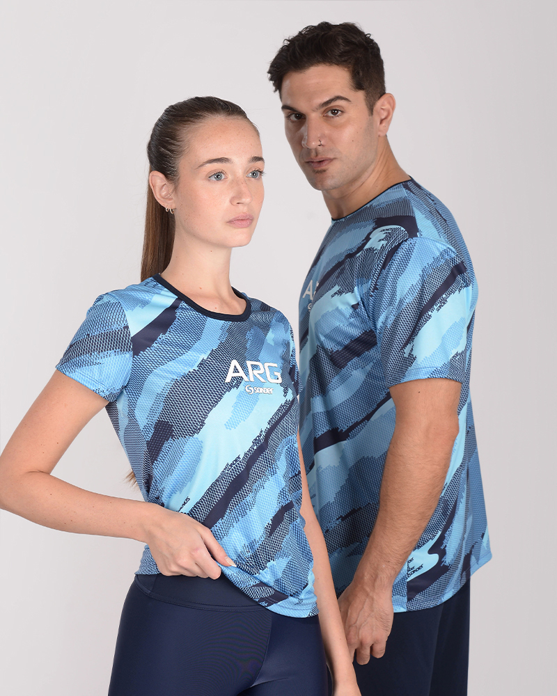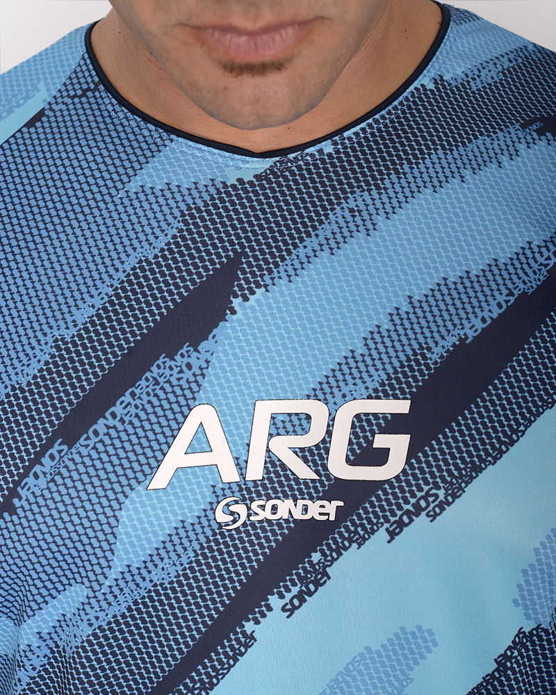 LÍNEA ARGENTINA. Remera clásica de poliéster Neodry estampado Tramo Celeste, con estampa Arg. La tecnología del poliéster Neodry permite mayor respirabilidad, rápido secado, confort térmico, color y textura resistentes.