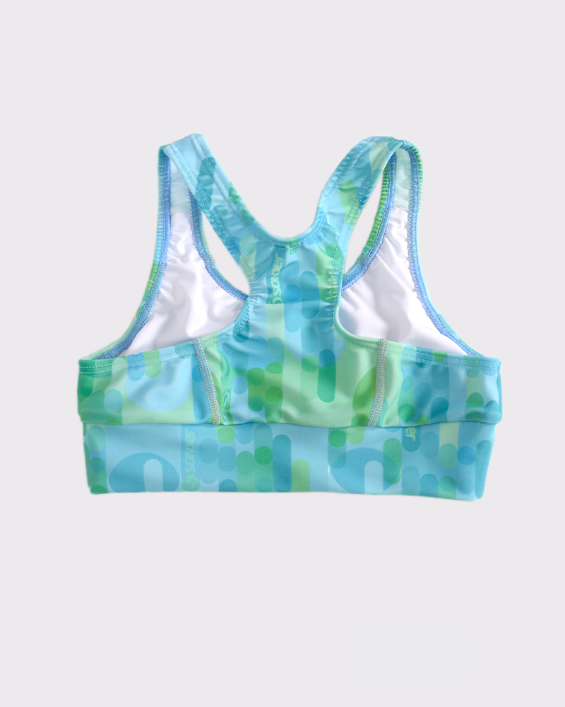 Top competición de niña, de LYCRA de seda estampada Ludo Verde, con recortes y faja.