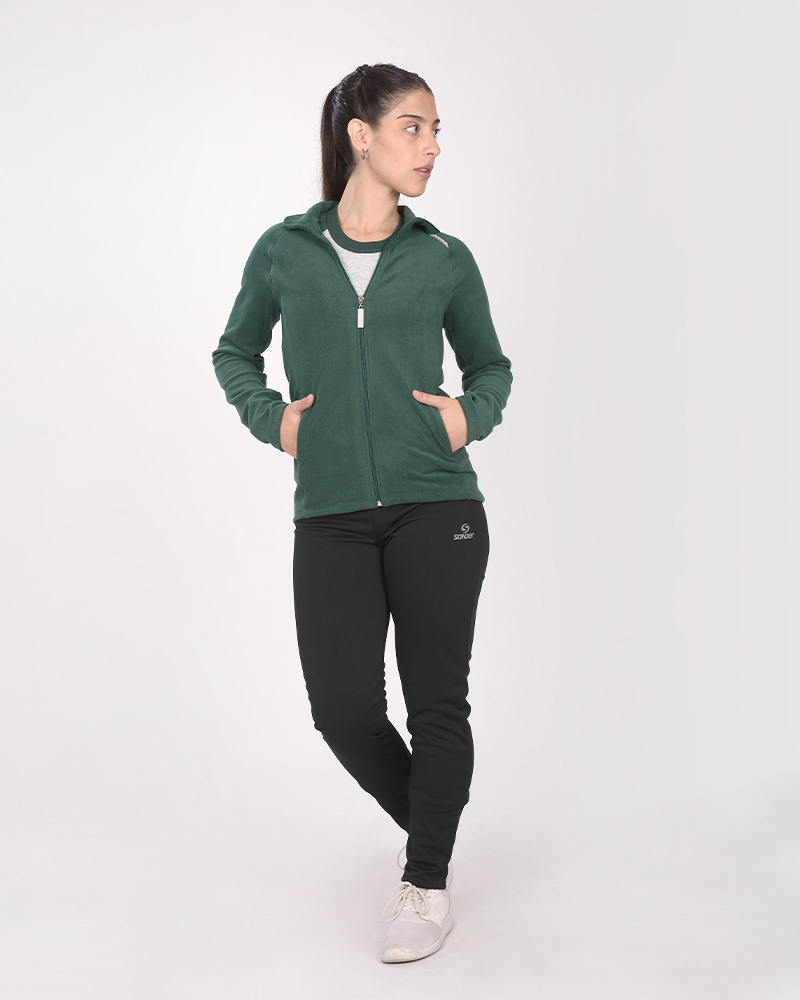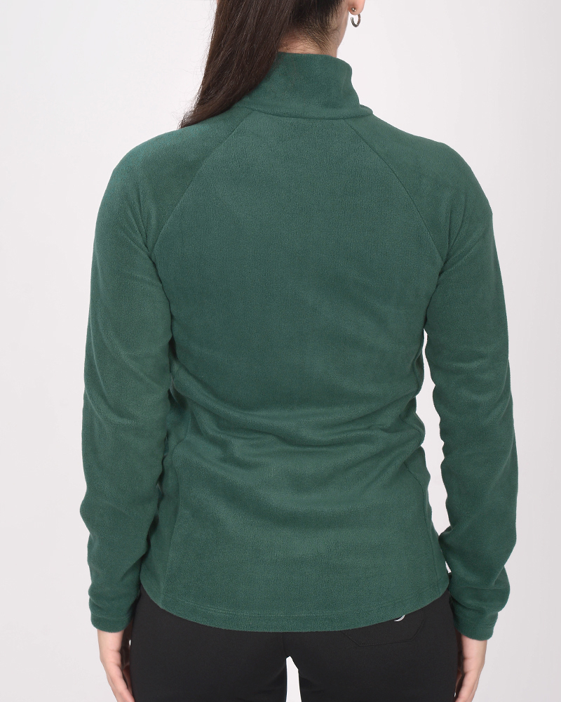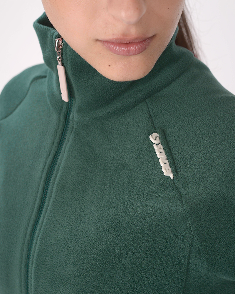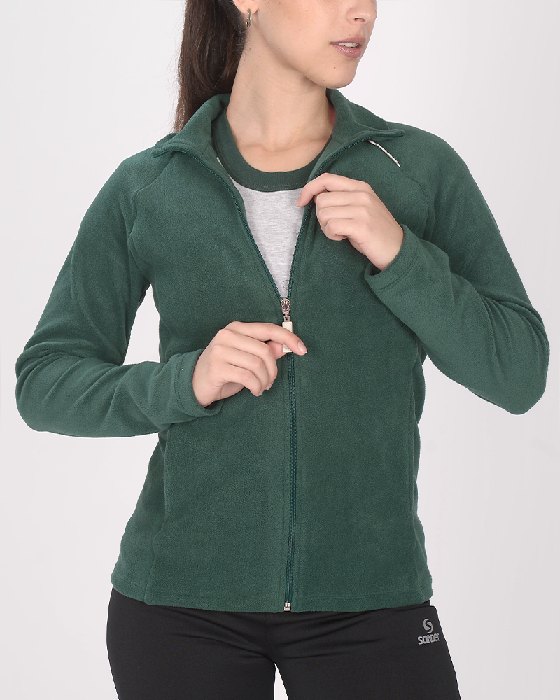 Campera entallada de micropolar verde noche, con cuello alto y bolsillos.