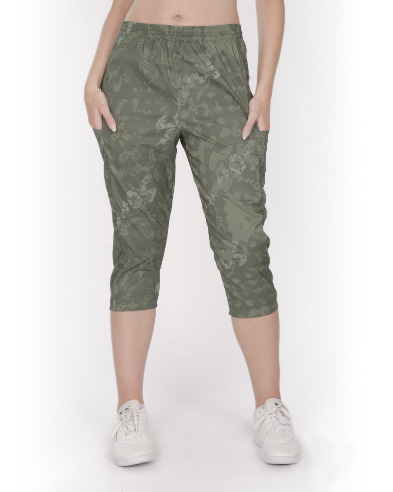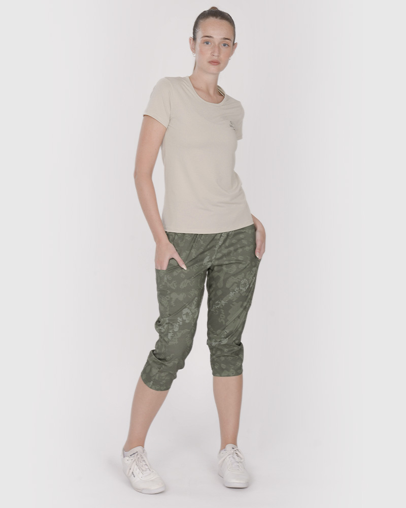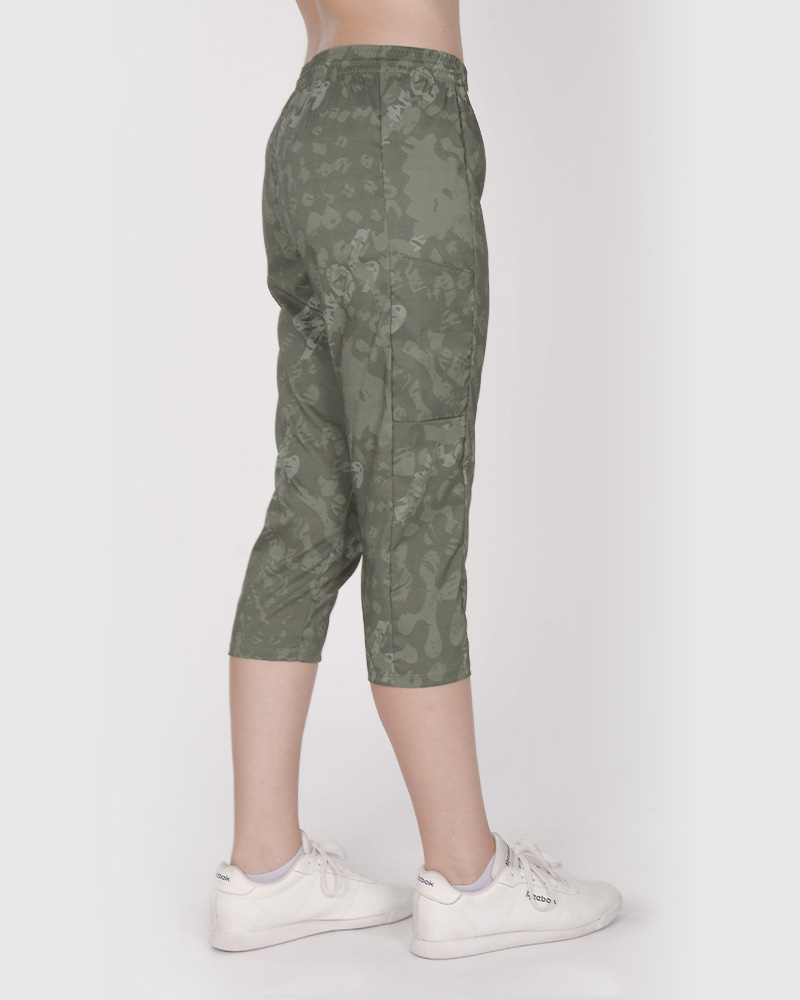 Pantalón Capri de microfibra elastizada estampada Senda Camo. Con cintura elastizada, recortes y bolsillos.