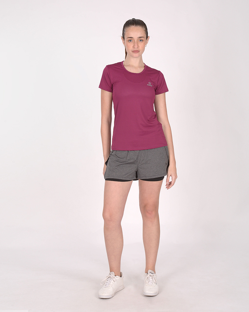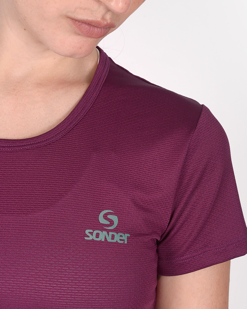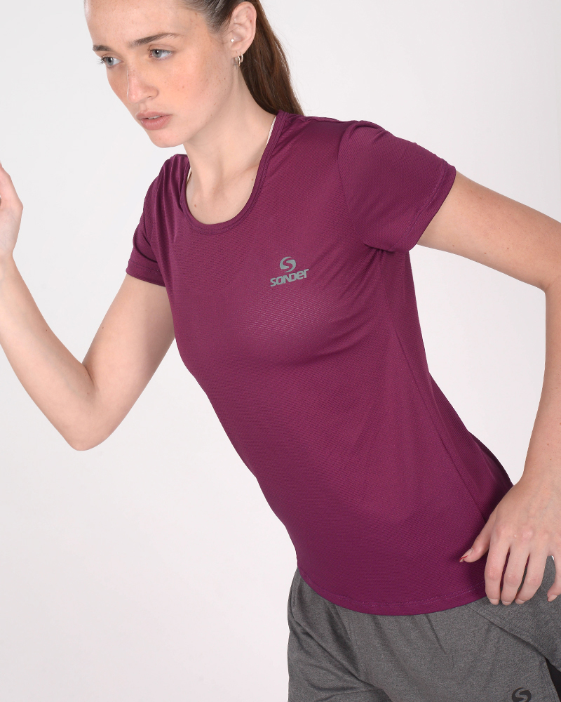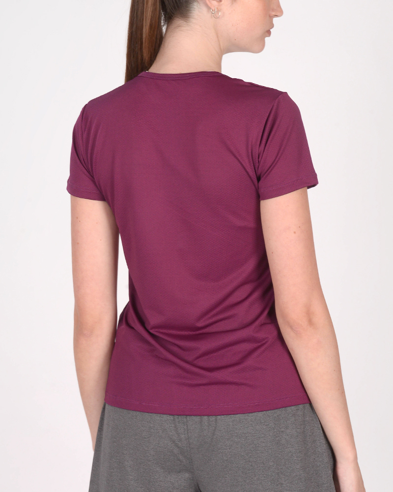 Remera clásica de poliéster tramado elastizado mora con estampa.