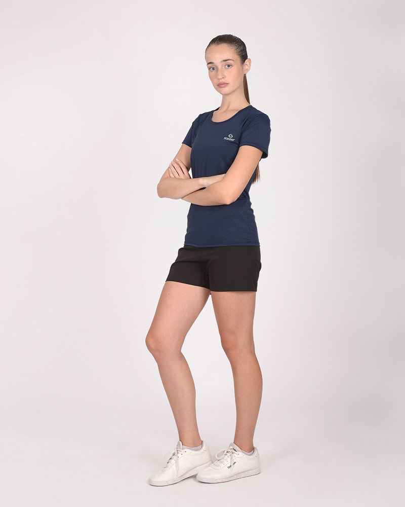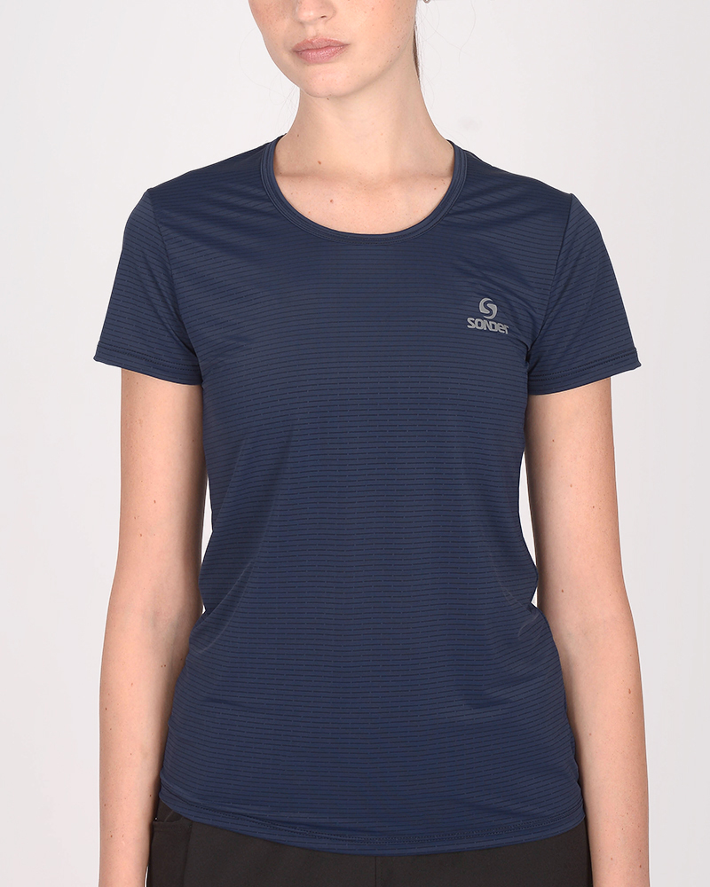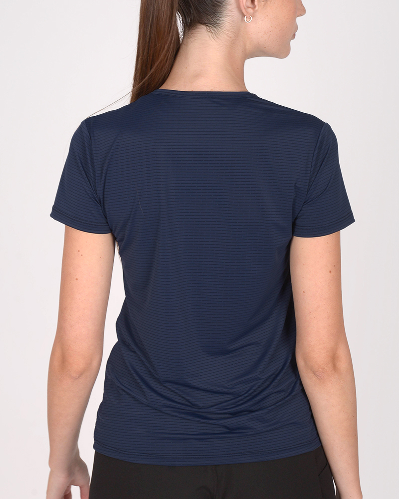 Remera clásica de poliéster tramado elastizado azul marino. El poliéster tramado elastizado permite mayor respirabilidad, es de secado rápido y tacto suave.