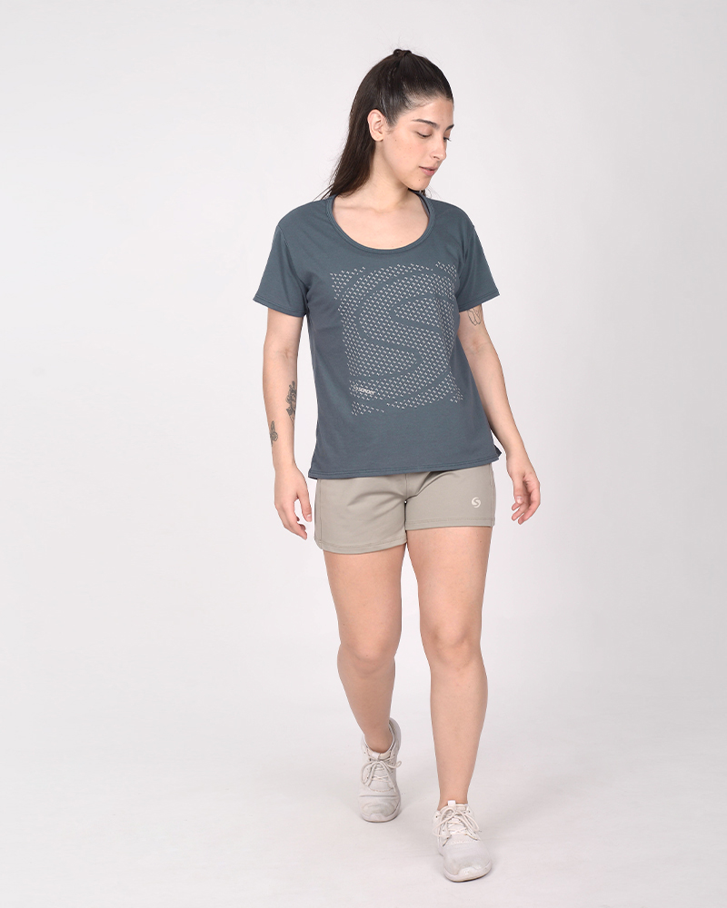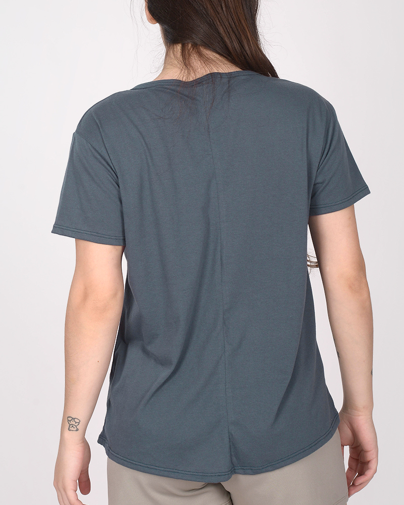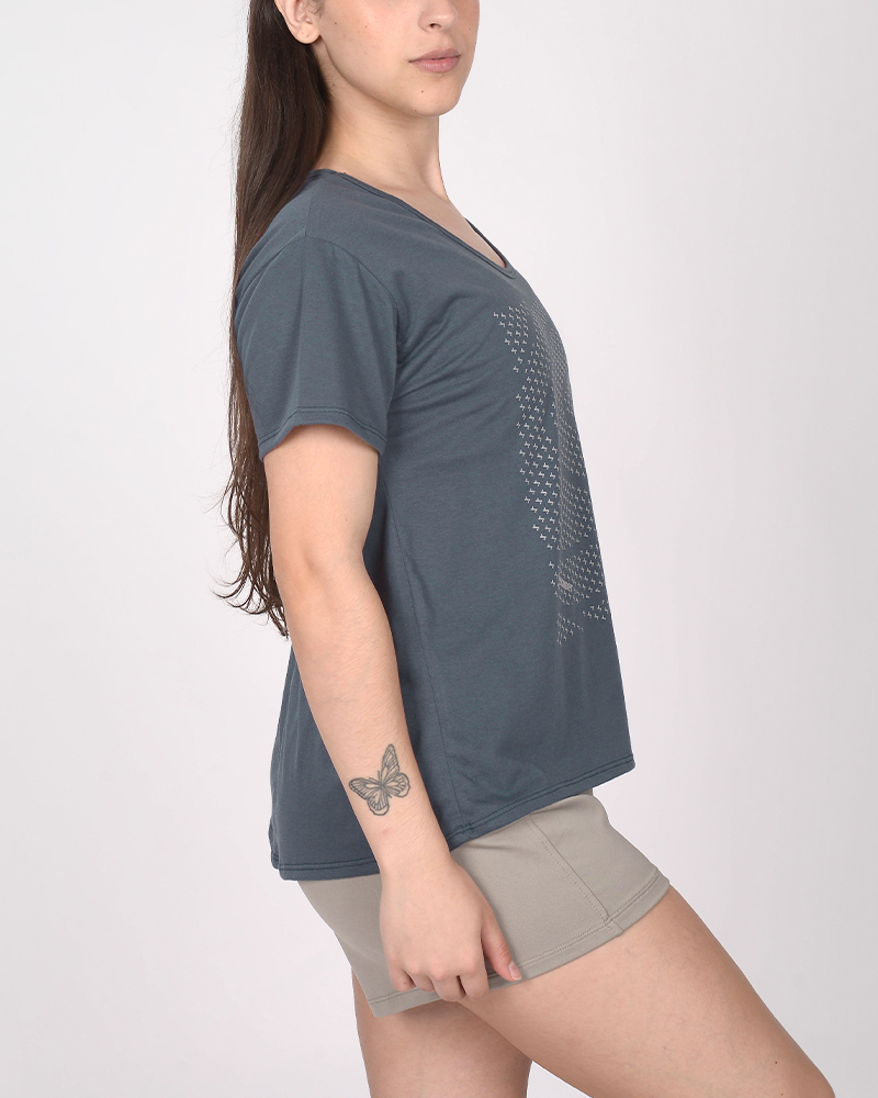 Remera corta y suelta de jersey liviano azul marino, con estampa.