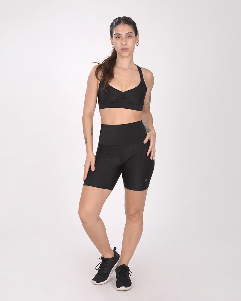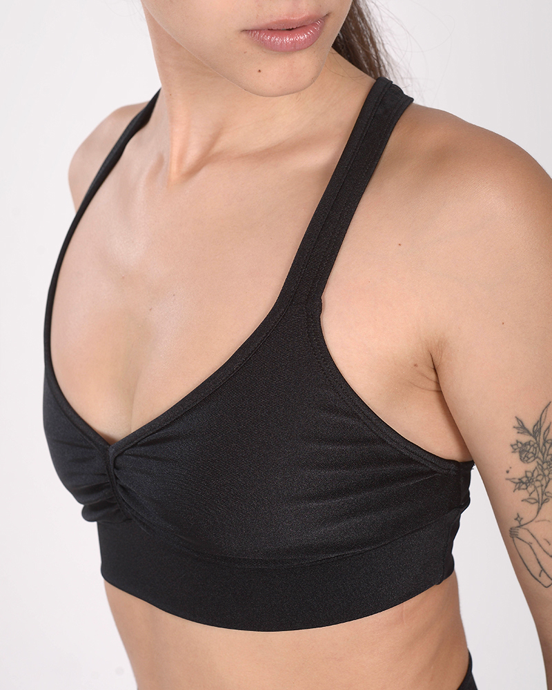 Top cempetición mini de LYCRA de seda metalizada negran, con frunce. La LYCA de seda metalizada: es de compresión media, cuenta con protección UV, es más brillante y su tacto es frío.