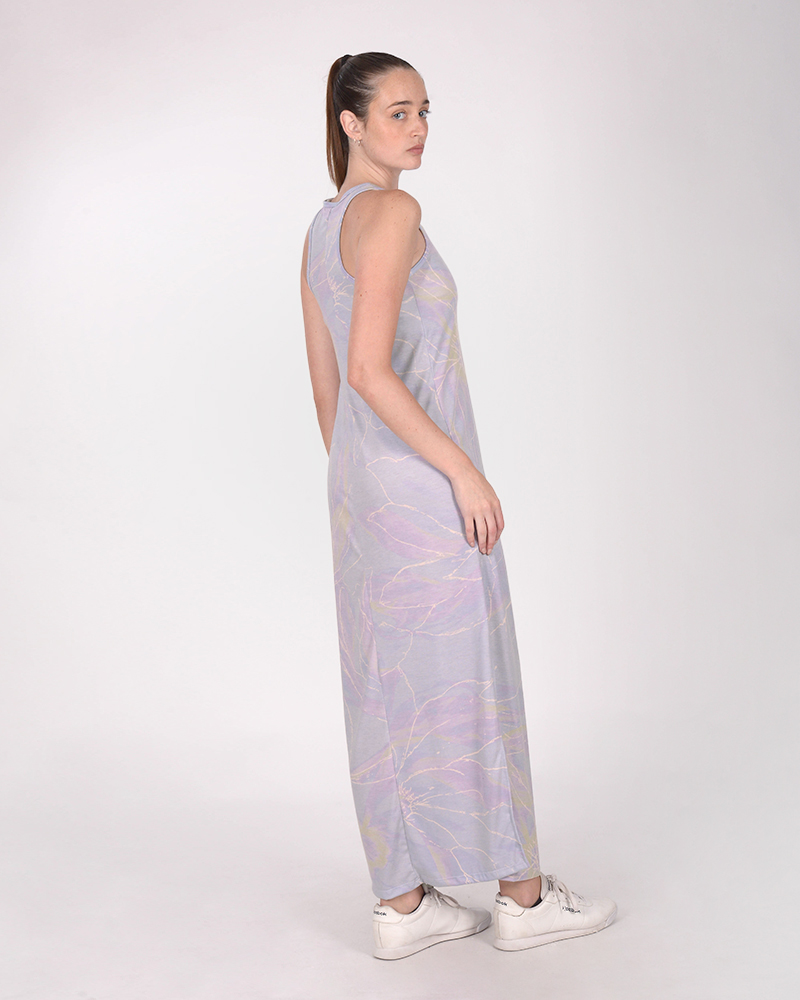 Vestido musculosa largo con escote americano, de jersey liviano estampado Fusión Lila, con tajos.