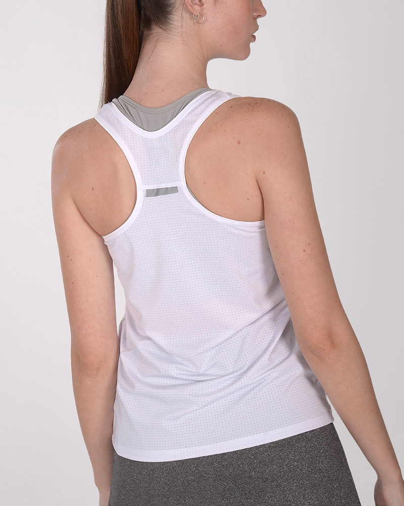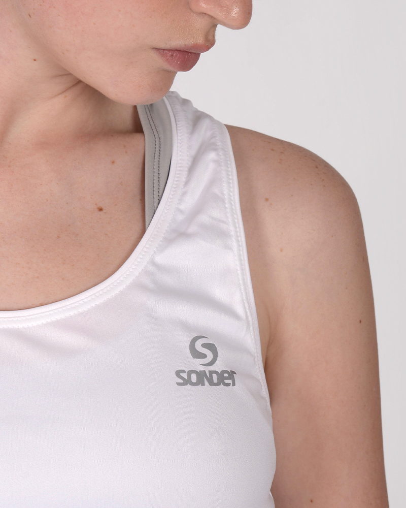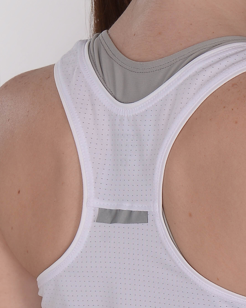 Musculosa con espalda competición de poliéster Neodry liviano blanco, combinado con poliéster calado elastizado. La tecnología Neodry permite mayor respirabilidad, rápido secado, confort térmico y color