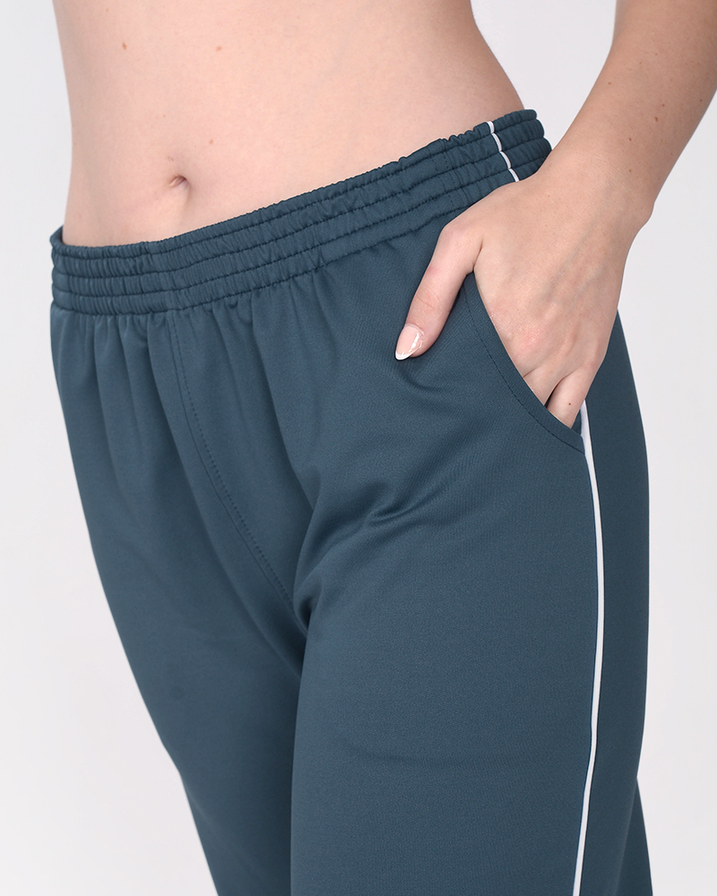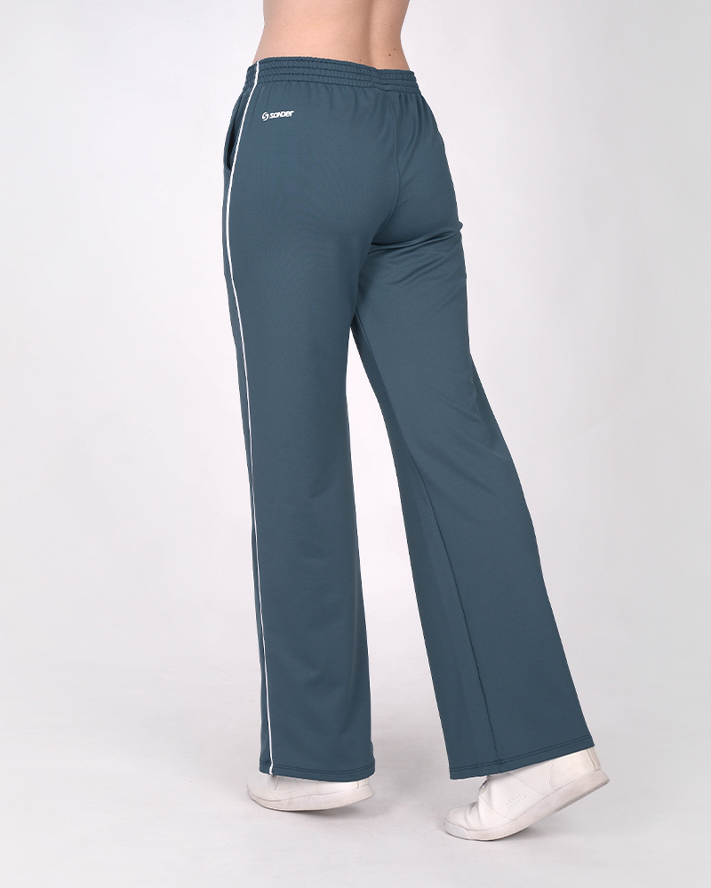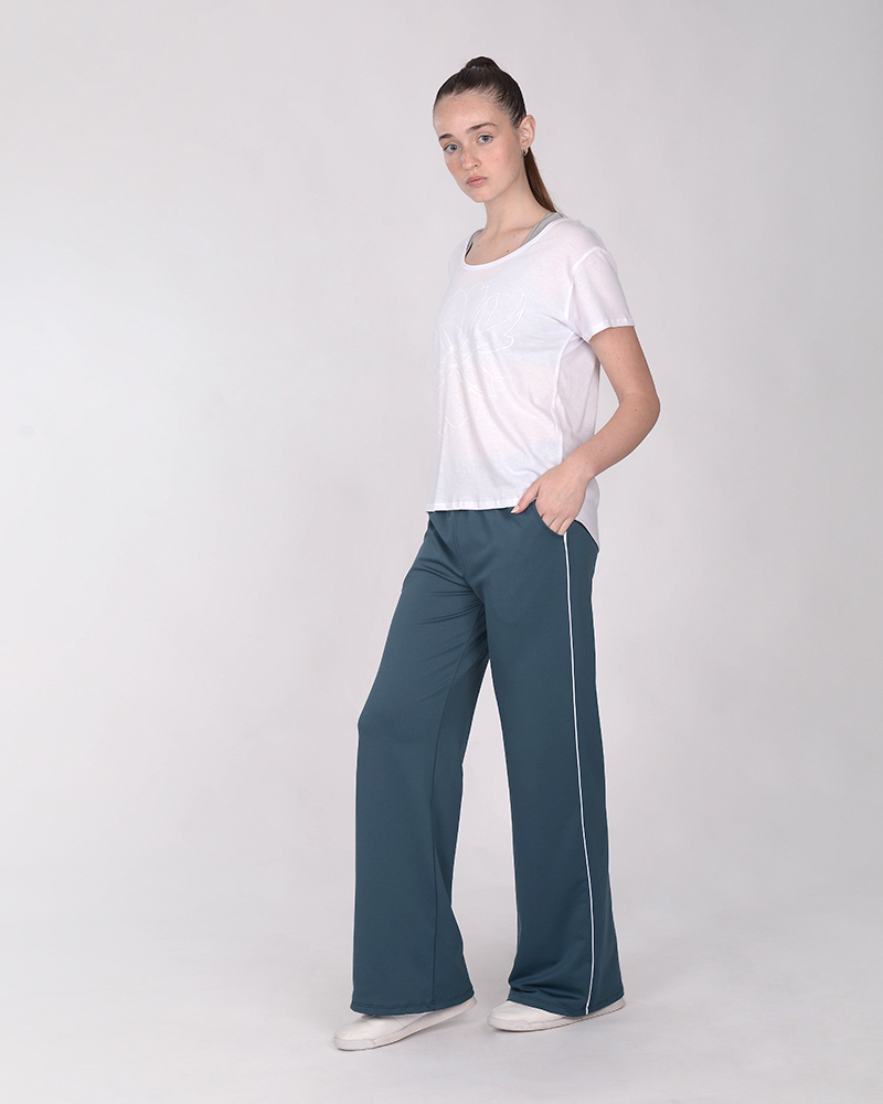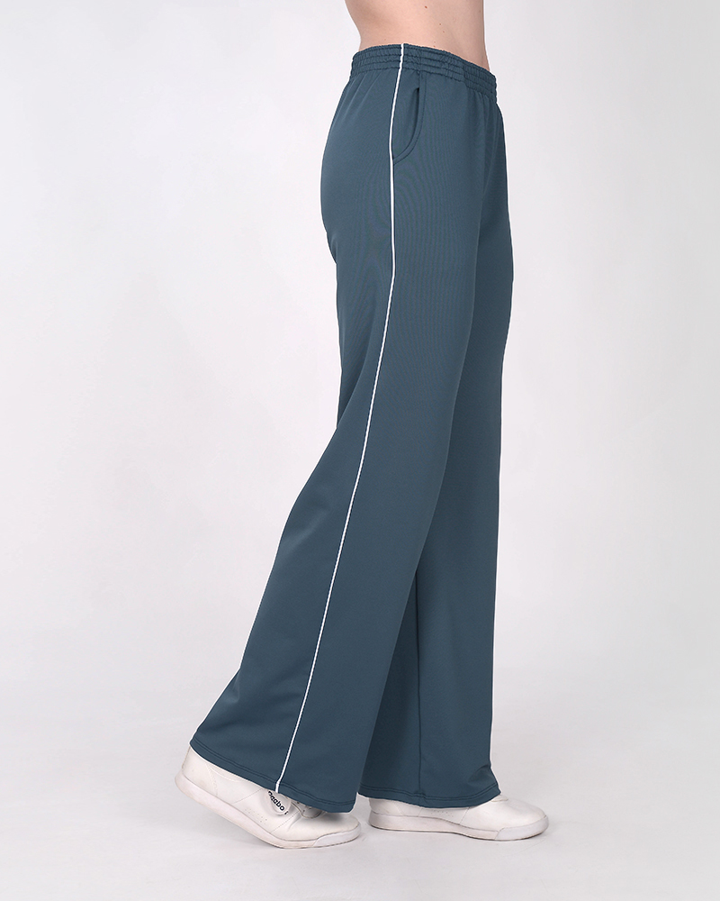 Pantalón palazzo de rústico elastizado azul marino claro, con bolsillos, cintura elastizada y vivos en laterales.