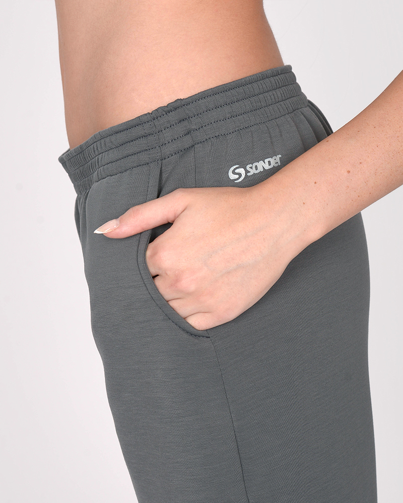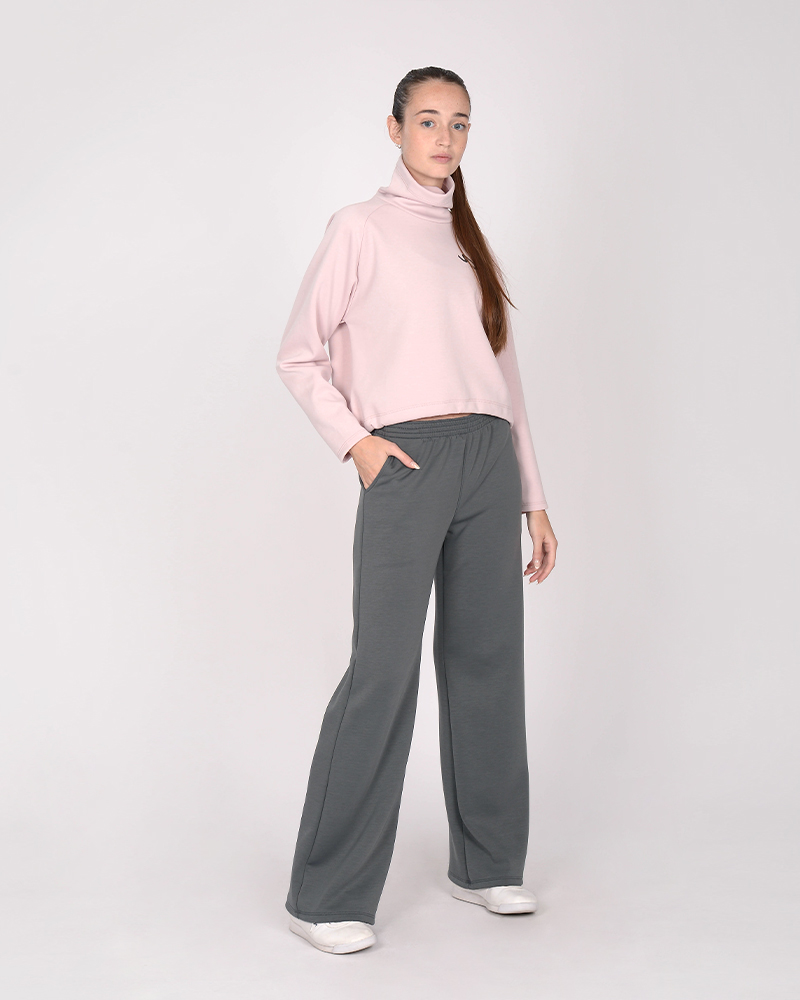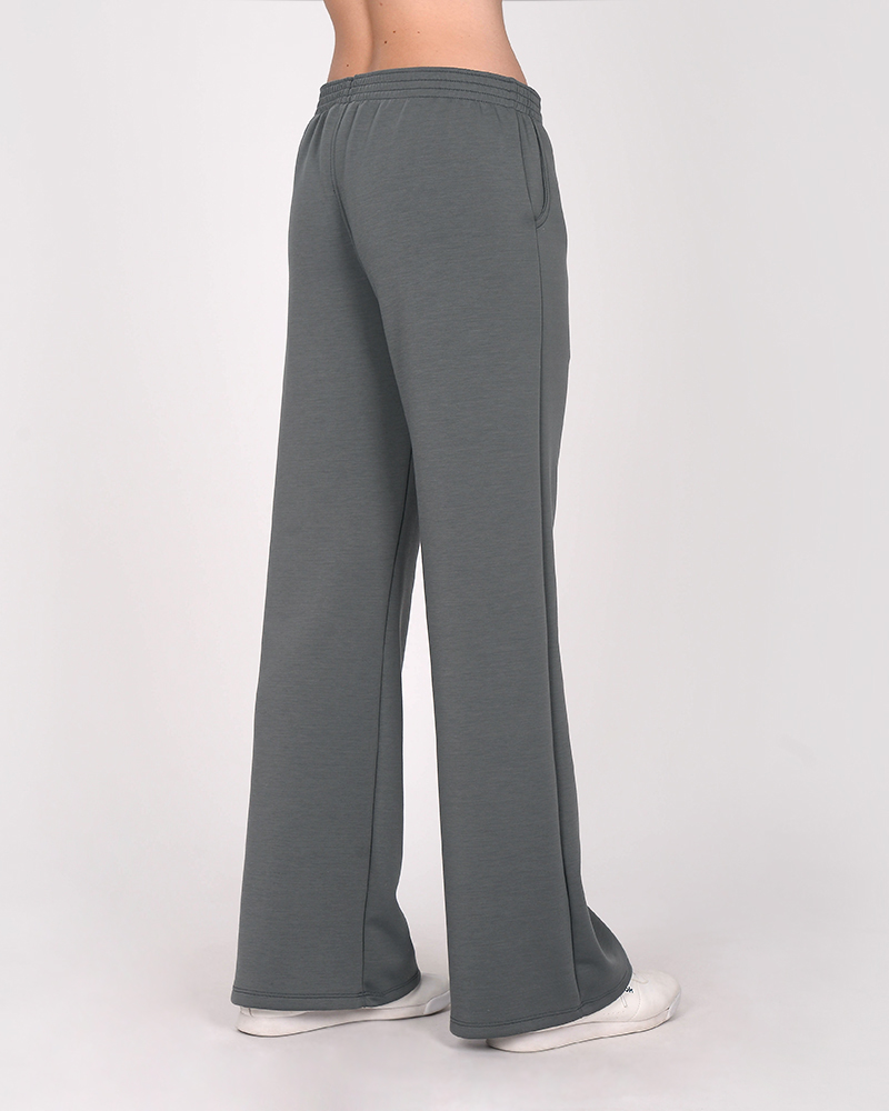 Pantalón palazzo de scuba elastizado gris plomo, con bolsillo. La scuba es abrigada, su tacto es suave y tiene el interior con frisa liviana.