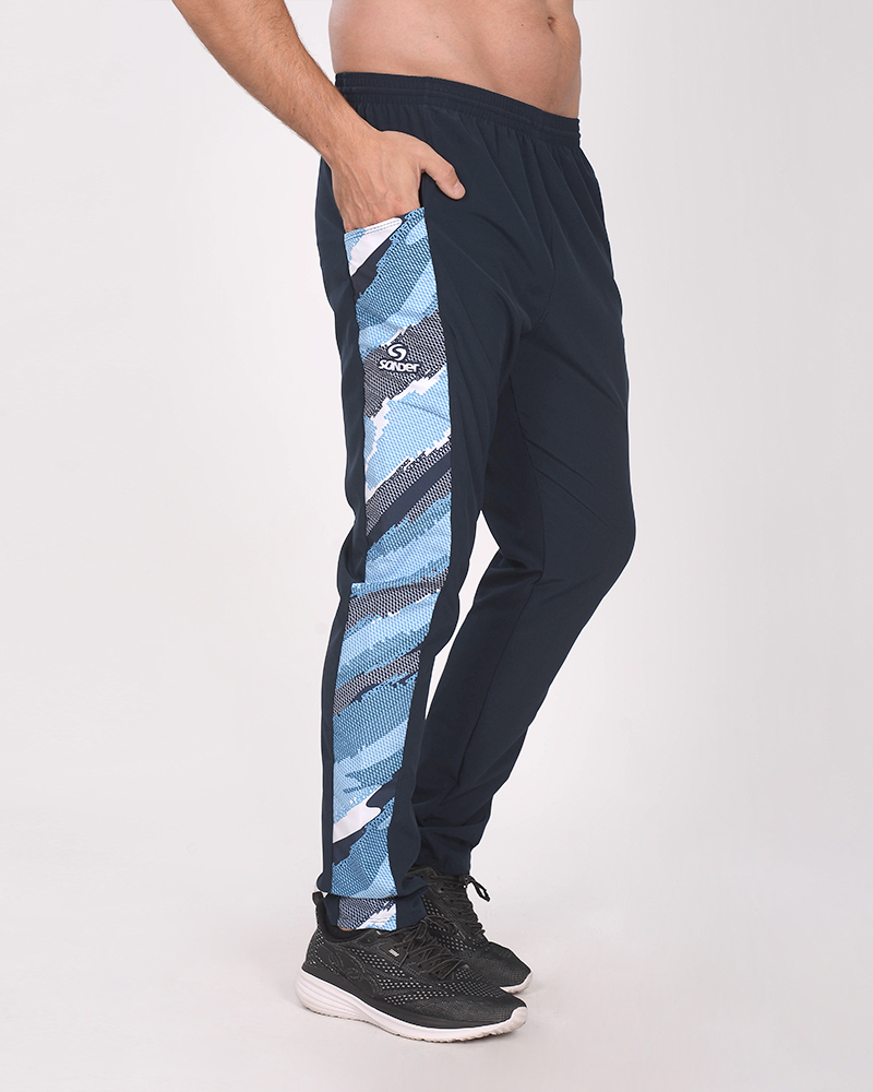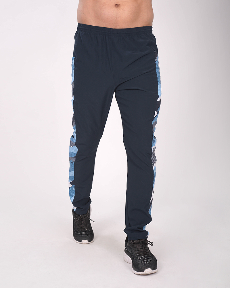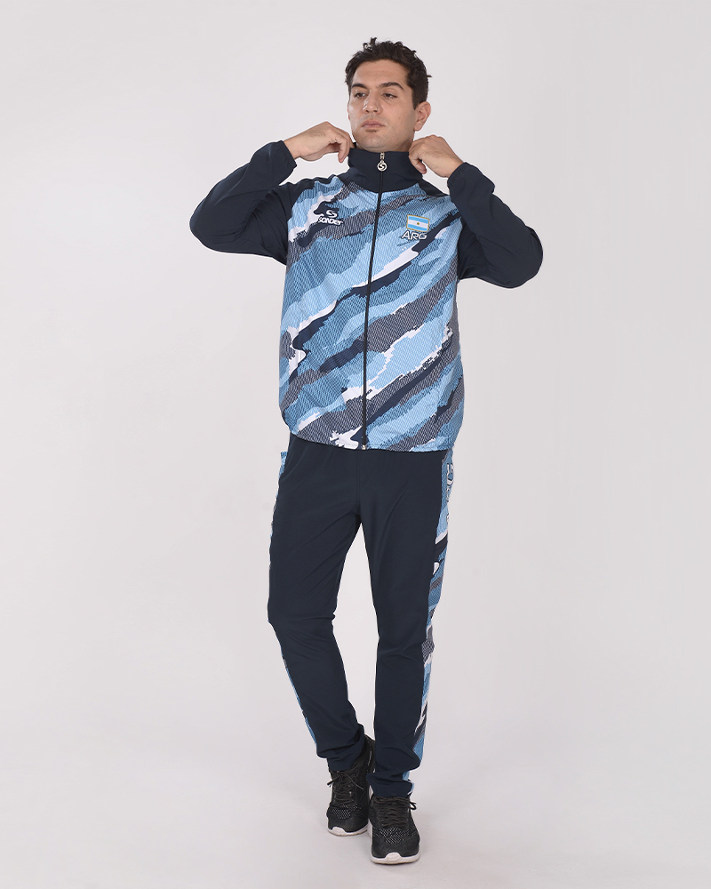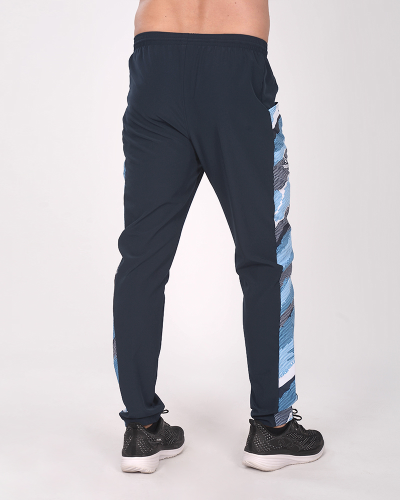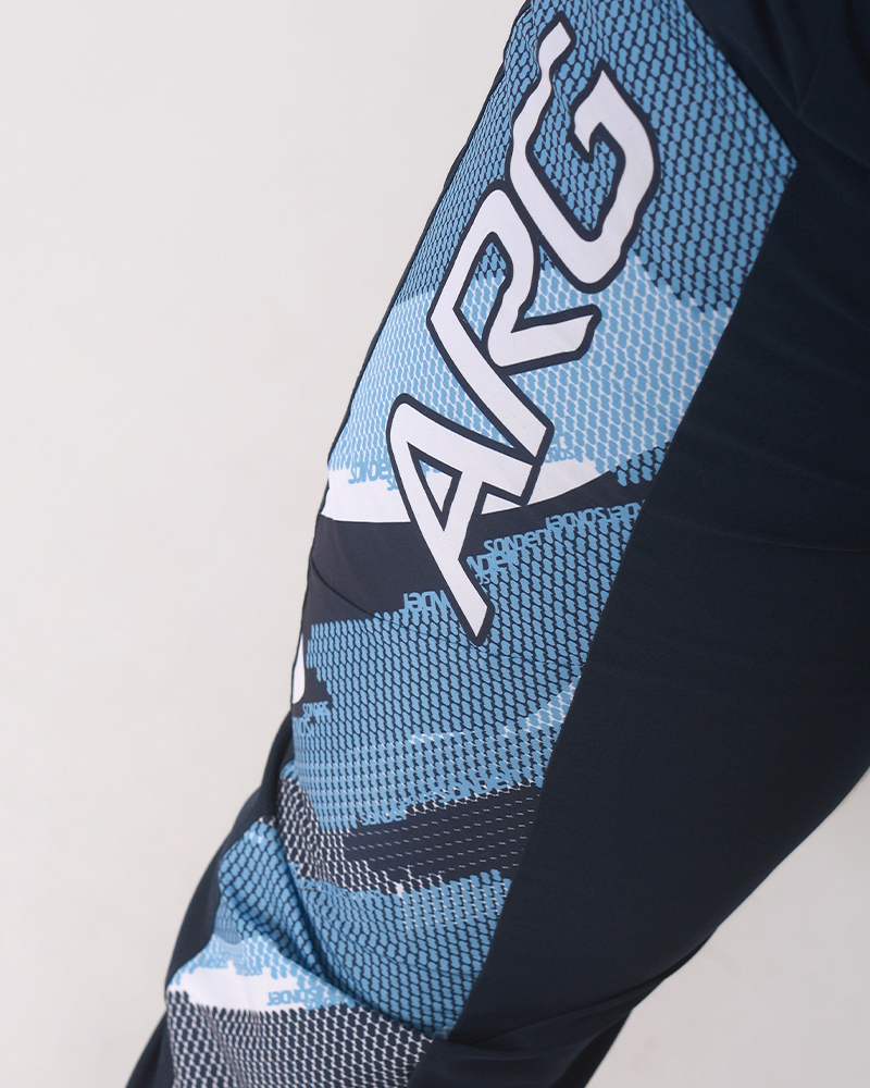 LÍNEA ARGENTINA. Pantalón largo de microfibra elastizada azul marino, con recortes combinados de poliéster elastizado estampado Tramo Celeste. Con bolsillos.