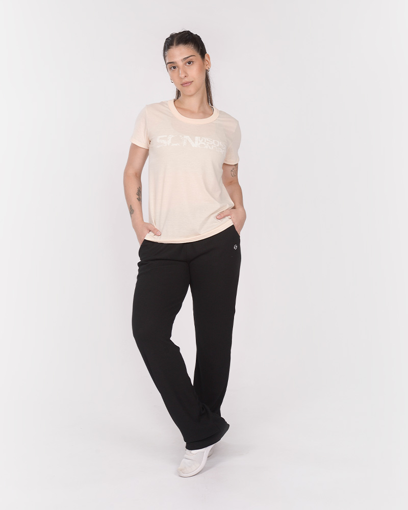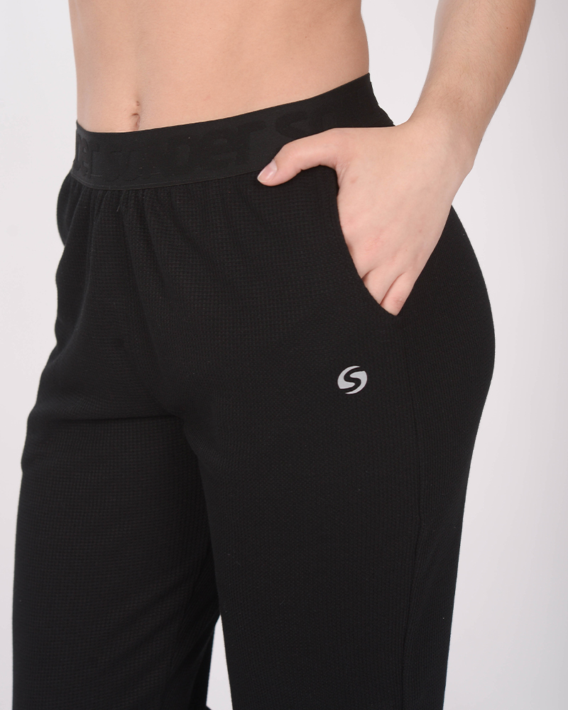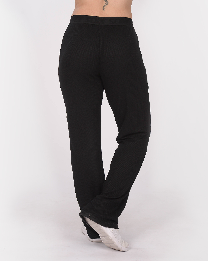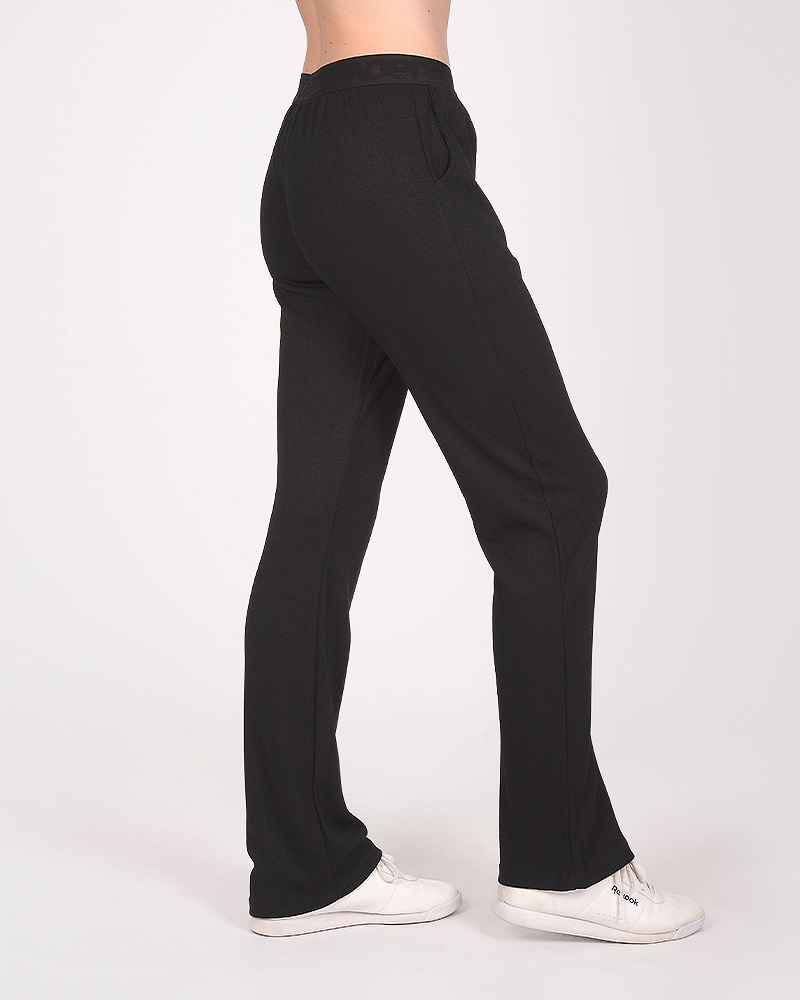 Pantalón recto de waffle elastizado negro, con bolsillos y cintura de elástico nominativo.