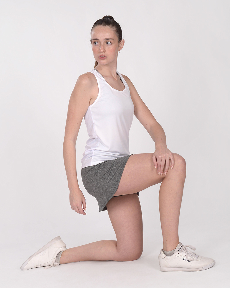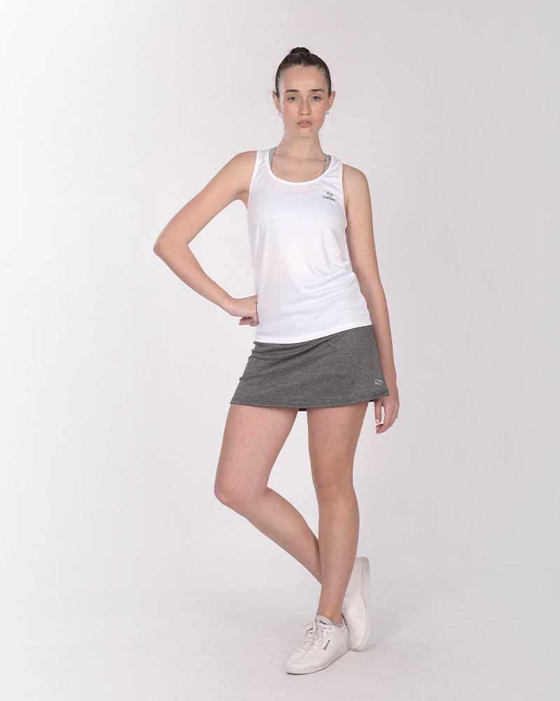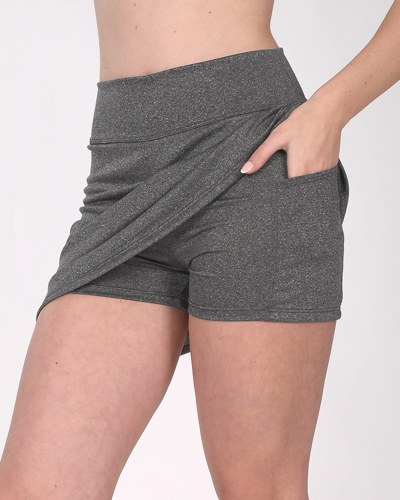 Pollera de microfibra elastizada liviana gris oscuro melange, con calza incorporada con bolsillo y cintura faja ancha.