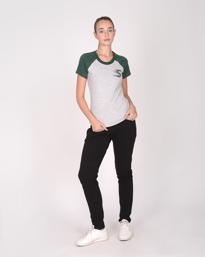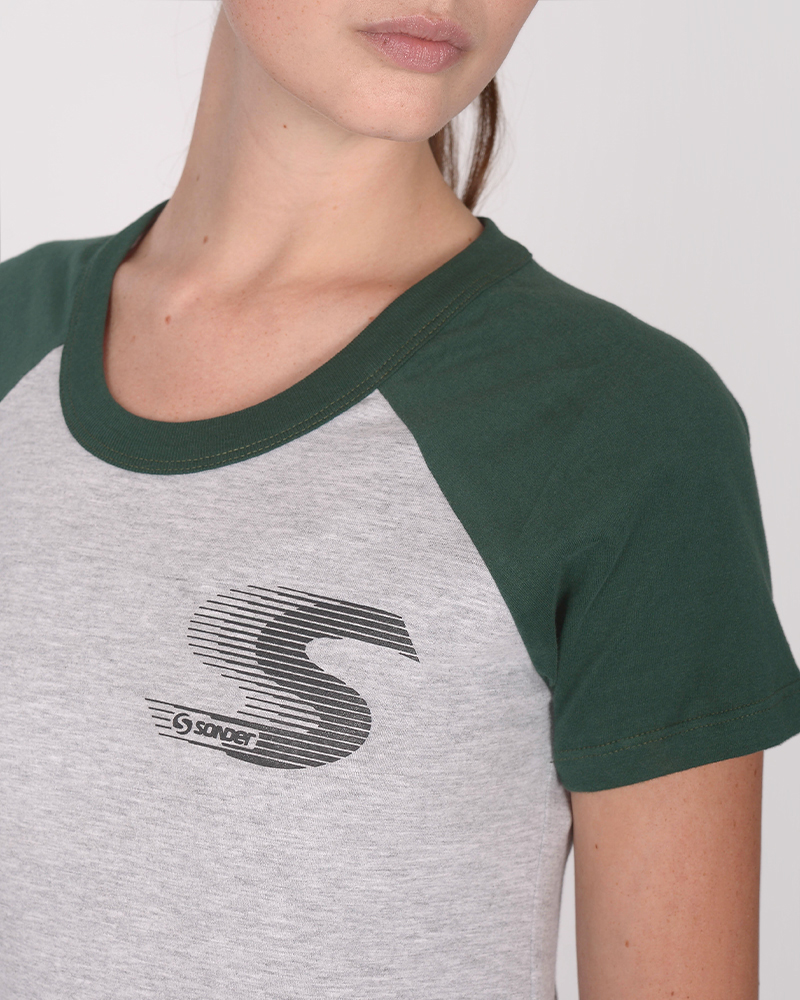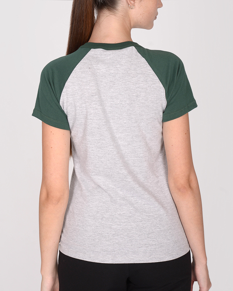 Remera clásica de jersey combinado gris melange, con manga ranglan verde noche y estampa.