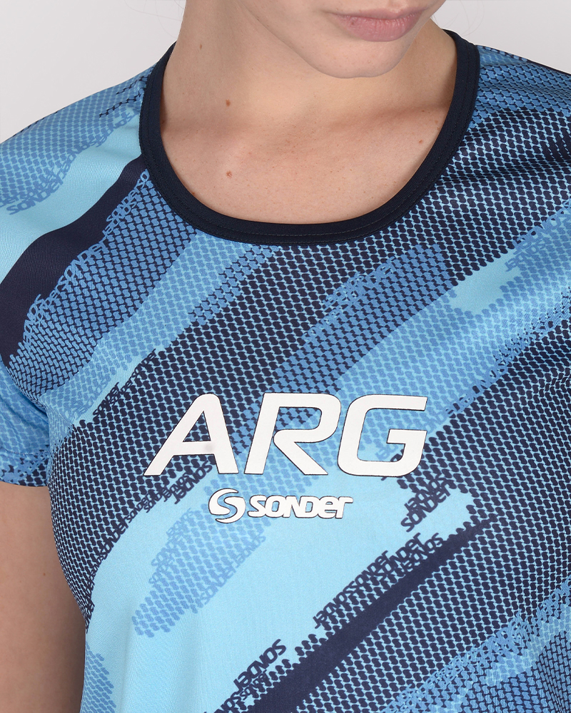 LÍNEA ARGENTINA. Remera clásica de poliéster Neodry estampado Tramo Celeste, con estampa Arg. La tecnología del poliéster Neodry permite mayor respirabilidad, rápido secado, confort térmico, color y textura resistentes.