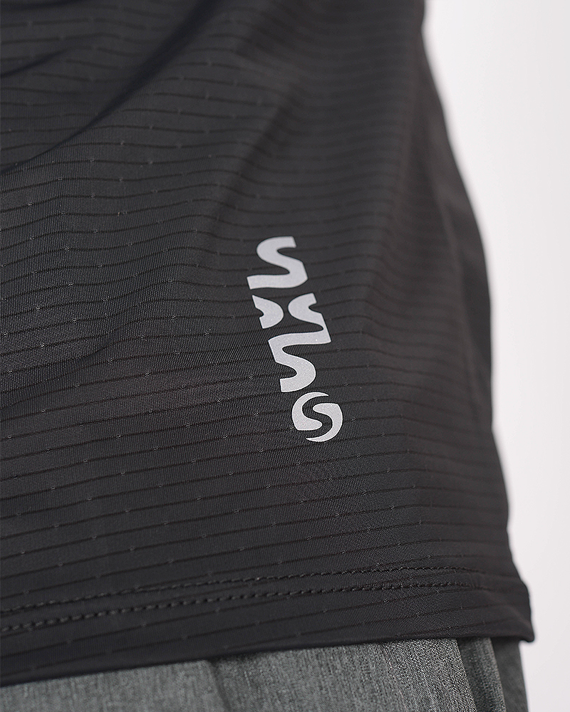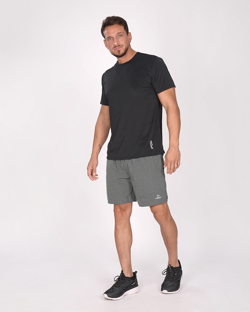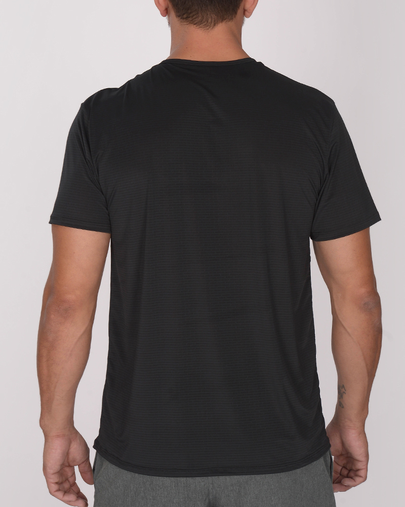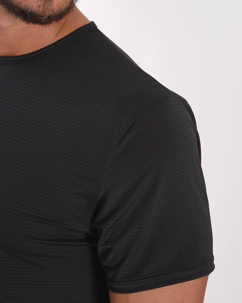 Remera clásica de poliéster tramado elastizado negro. El poliéster tramado elastizado permite mayor respirabilidad, es de secado rápido y tacto suave.
