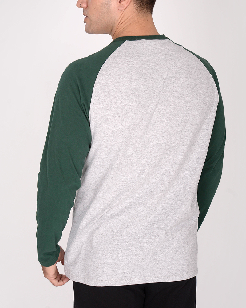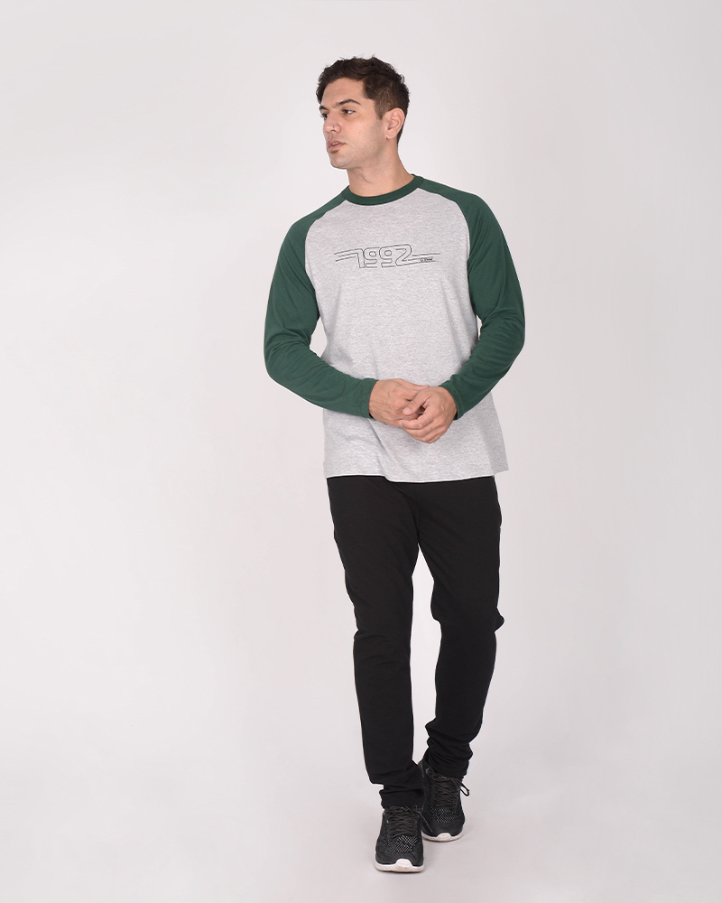 Remera clásica de jersey gris melange claro, con mangas combinadas color verde noche. Con estampa.
