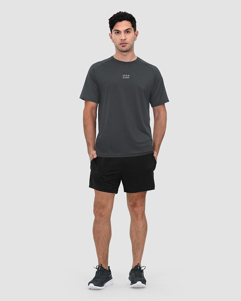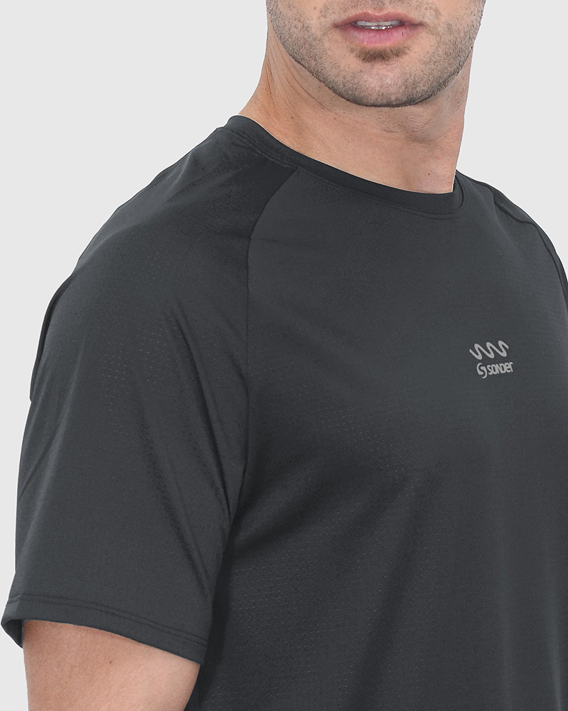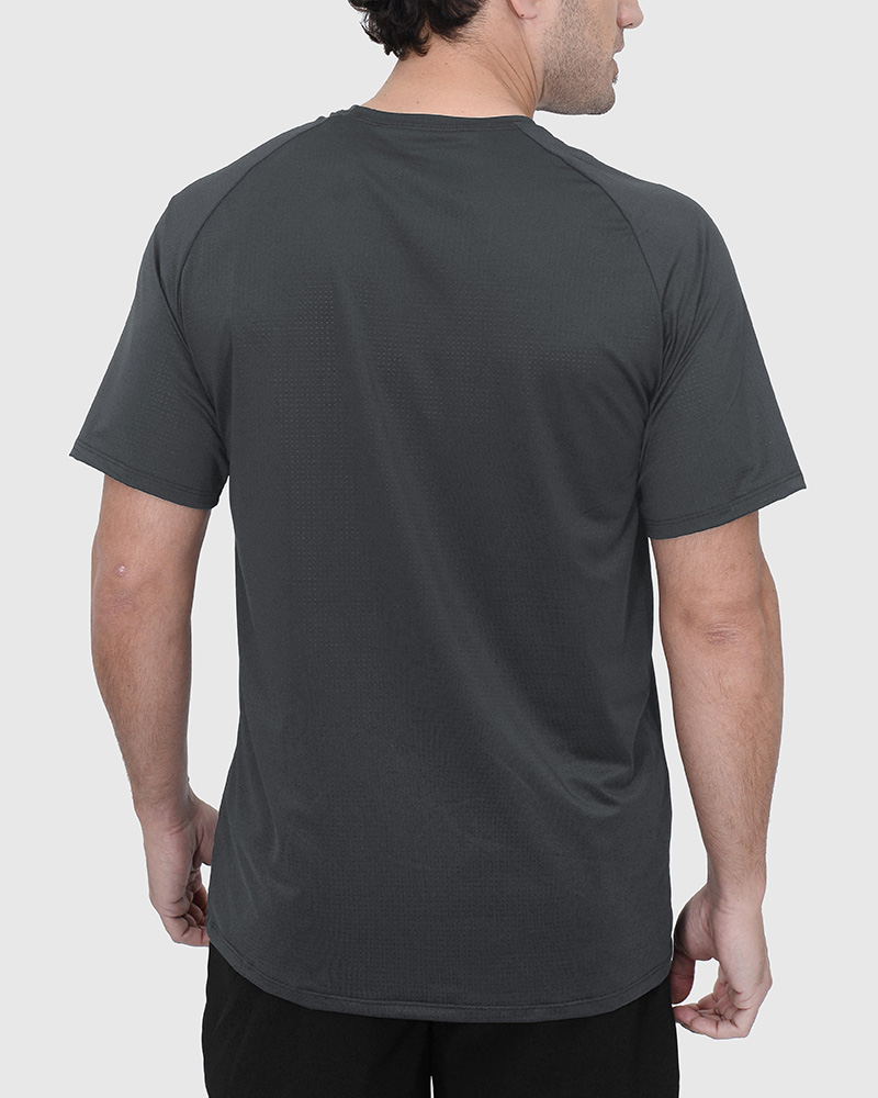 Remera entallada de poliéster calado elastizado gris plomo. El poliéster calado elastizado permite mayor respirabilidad y secado rápido; el tacto es suave.