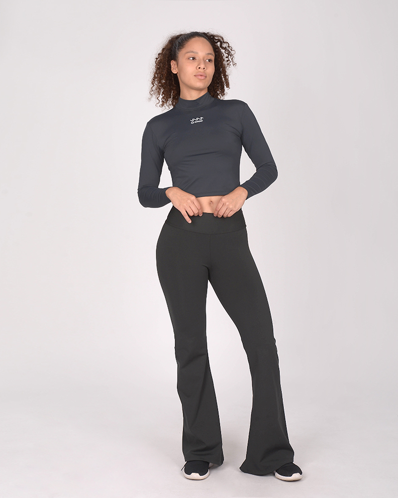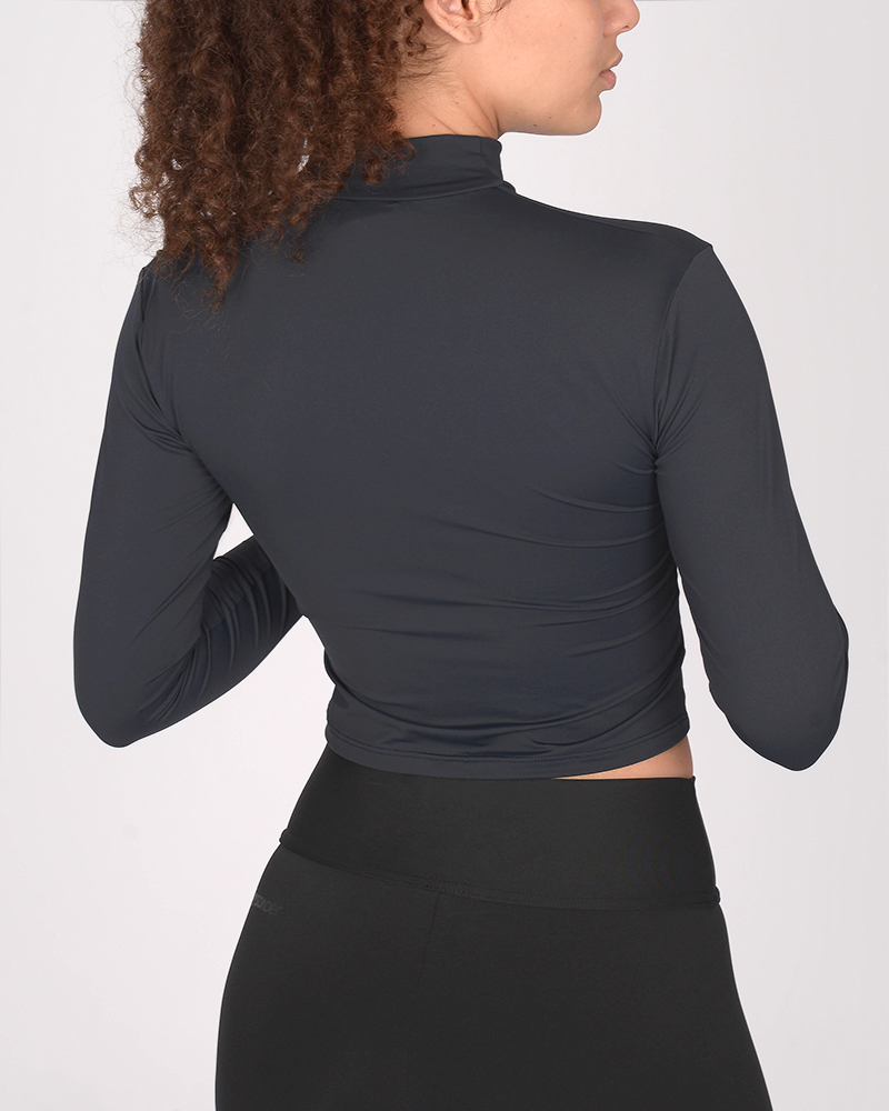 Remera polera entallada corta mangas largas de seda elastizada UV Gris oscura. Con estampa. La seda elastizada UV, es liviana, de tacto suave y brinda confort térmico.