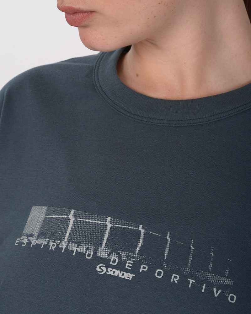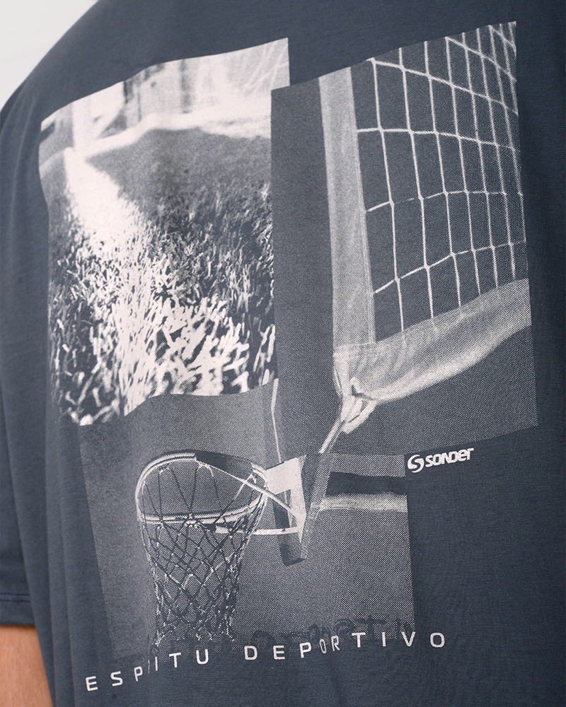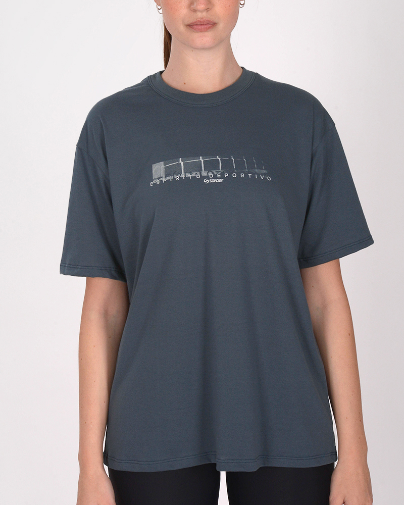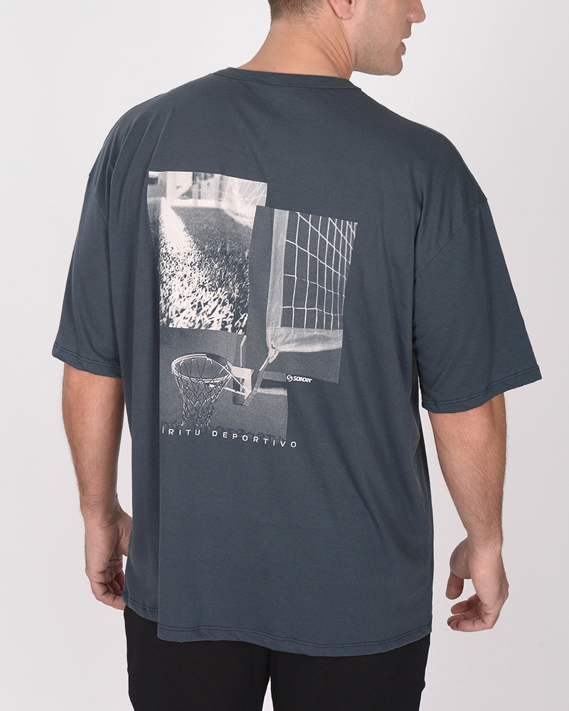 Remera oversize de jersey liviano azul marino, con estampa en frente y espalda.