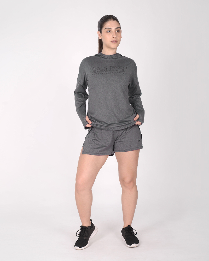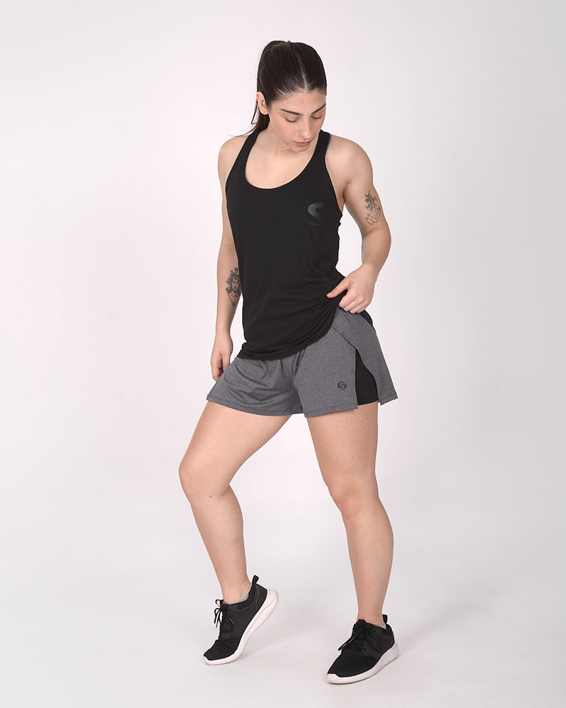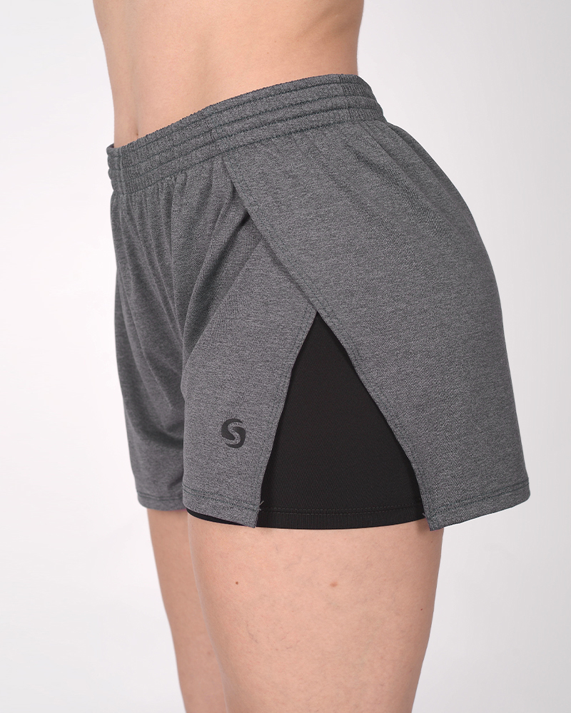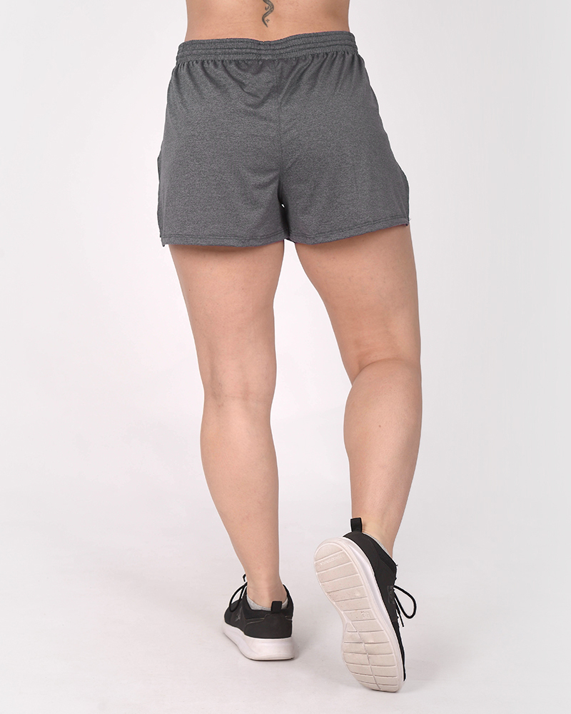 Short de entrenamiento de microfibra elastizada liviana gris oscuro melange con calza incorporada y cintura elastizada.